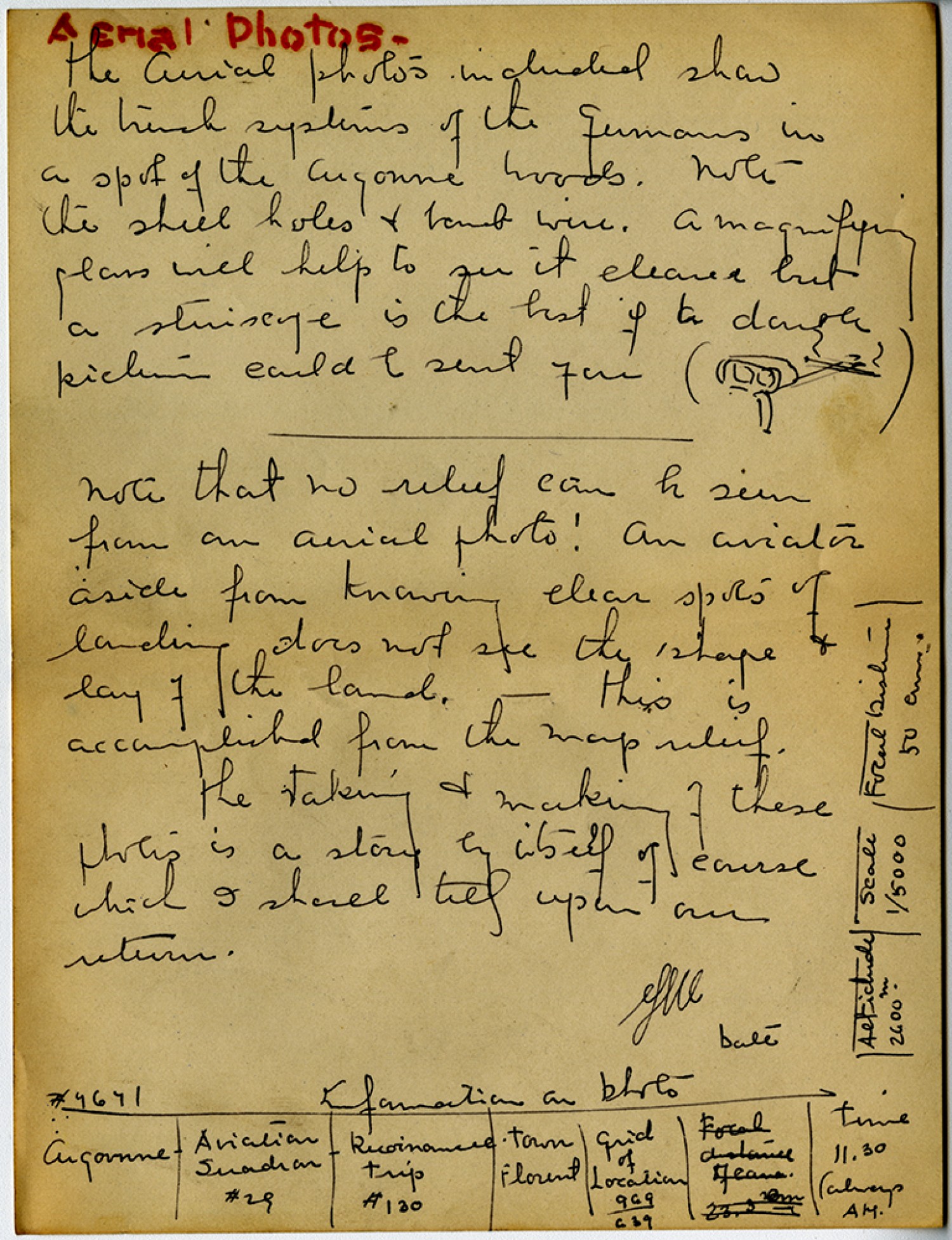 Aerial Photos – the aerial photos show the trench systems of the germans in a spot of the Argonne woods. Note the shell holes & barb wire. A magnifying glass will help to see it clearer but a steriscope is the best if a double picture could be sent you [sketch] - note that no relief can be seen from an aerial photo! An aviator aside from knowing clear spots of landing does not see the shape & lay of the land. - this is accomplished from the map relief. The taking & making of these photos is a story by itself of course which I shall tell upon our return. [George Maguolo] Date #4671 Explanation of photos [chart] Argonne Aviation Squadron #29 Recoinance Trip #130 Town Florent grid of location 969/639 Time 11.30 (Always A.M. Altitude 2600 m. Scale 1/5000 Focal Distance 50 cm.