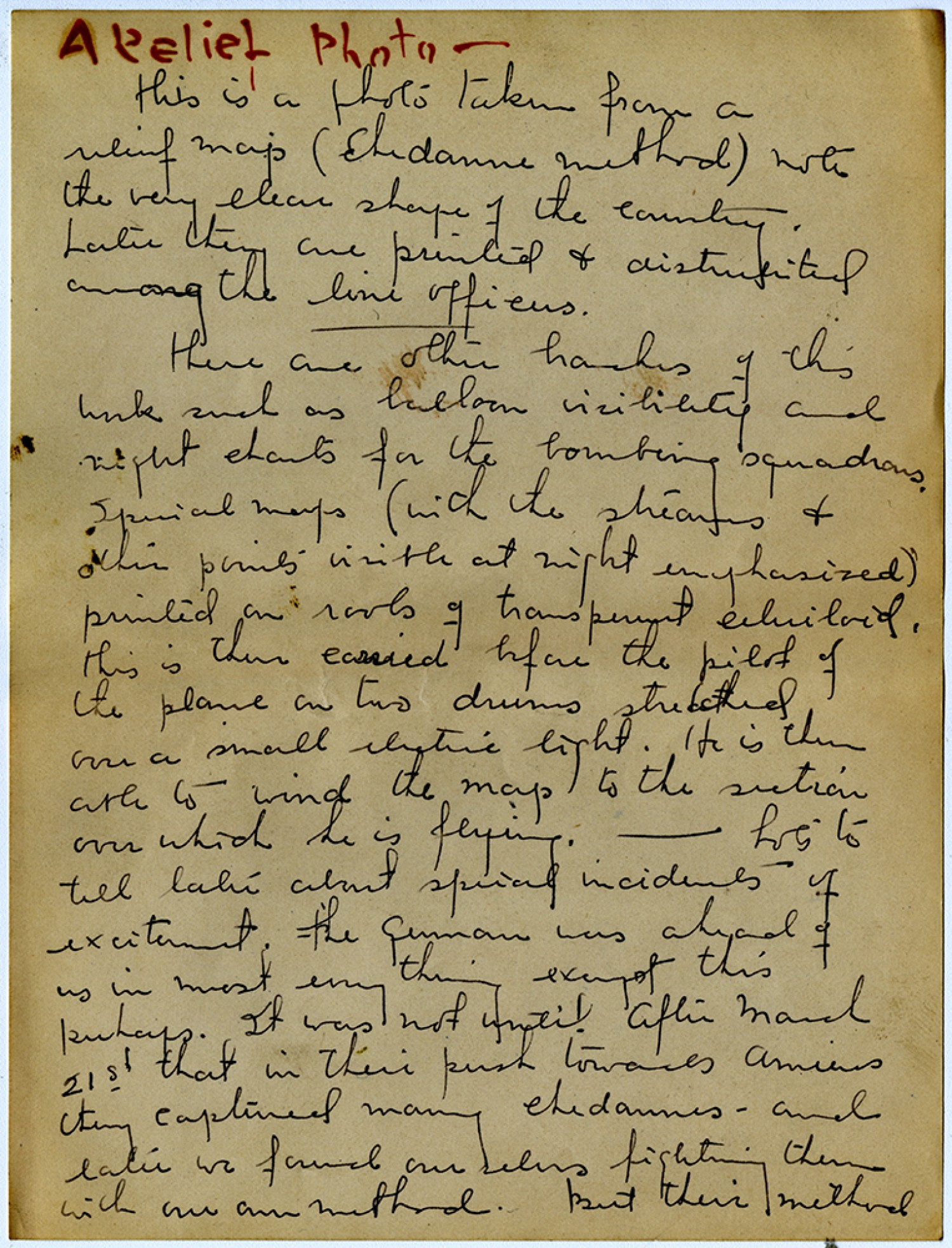 A Relief Photo – this is a photo taken from a relief map (Chedanne Method) note the very clear shape of the country. Later they are printed & distributed among the line officers. there are other branches of this work such as balloon visibility and night charts for the bombing squadrons. Special maps (with the streams & the points visible at night emphasized) printed on rolls of transparent celuiloid. This is then carried before the pilot of the plane on two drums stretched over a small electric light. He is then able to wind the maps to the section over which he is flying. - Lots to tell later about special incidents of excitement. the german was ahead of us in most every thing except this perhaps. It was not until after March 21st that in their push towards Amiens they captured many Chedannes – and later we found ourselves fighting them with our own method. But their method
