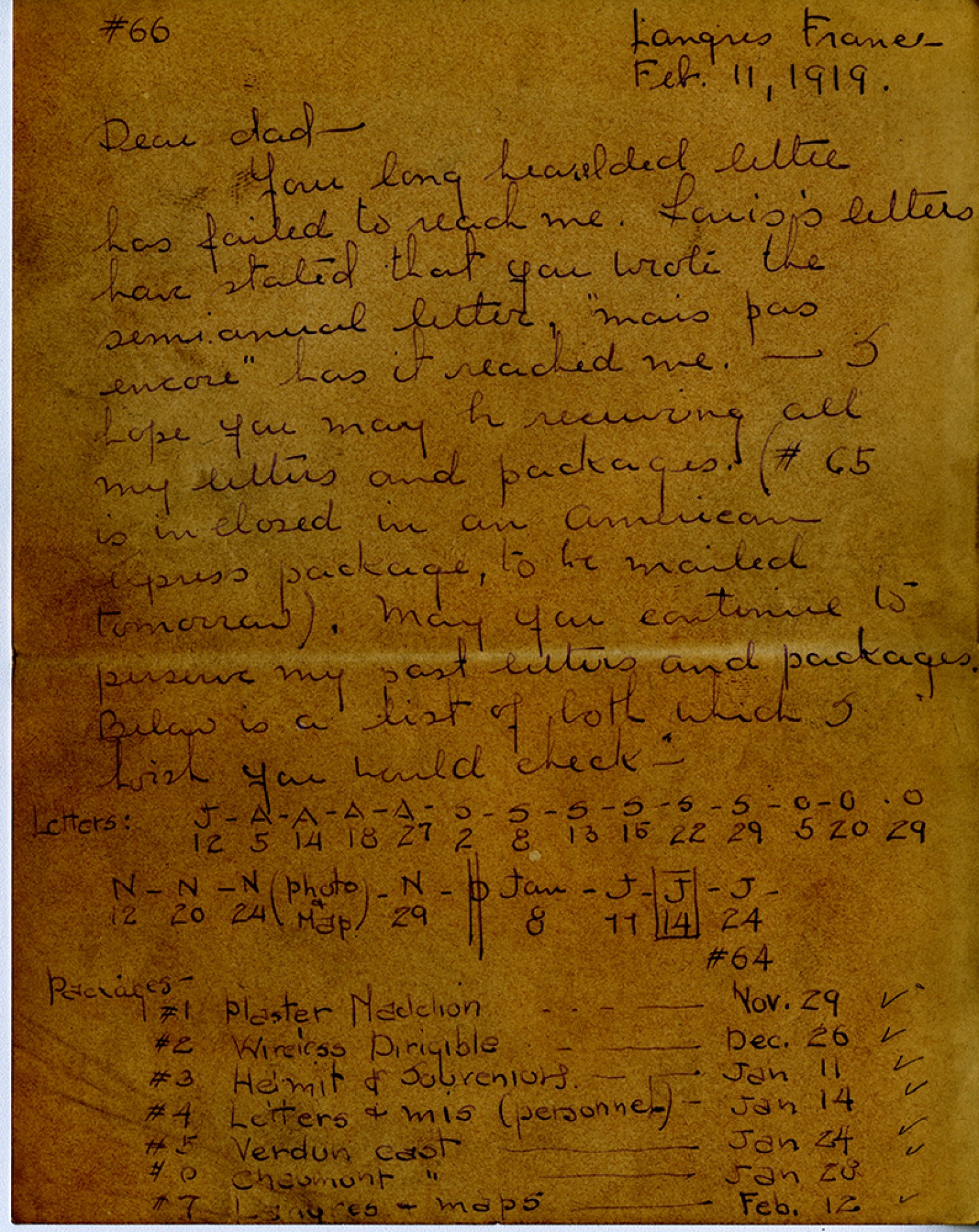 #66 Langres France - [February] 11, 1919. Dear dad - Your long hearelded letter has failed to reach me. Louis’s letters have stated that you wrote the semiannual letter, “mars pas encore” has it reached me. – I hope you may be receiving all my letters and packages. (#65 is inclosed in an American express package, to be mailed tomorrow). May you continue to perserve my past letters and packages. Below is a list of both which I wish you would check - Letters: [July] 12 [August] 5 [August] 14 [August] 18 [August] 27 [September] 2 [September] 8 [September] 13 [September] 15 [September] 22 [September] 29 [October] 5 [October] 20 [October] 29 [November] 12 [November] 20 [November] 24 (photo and Map) [November] 29 [January] 8 [January] 11 [January] 14 [January] 24 #64 Packages #1 Plaster Madelion - [November] 29 [check mark] #2 Wireless Dirigible - [December] 26 [check mark] #3 Helmit & Souveniors - [January] 11 [check mark] #4 Letters & mis (personnel) - [January] 14 [check mark] #5 Verdun cast - [January] 24 [check mark] #6 Chaumont [cast] - [January] 28 [check mark]#7 Langres & maps - [February] 12 [check mark]
