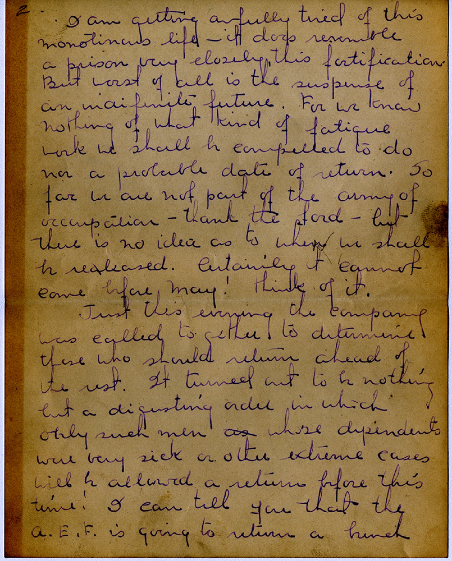 [page 2] I am getting awfully tired of this monotinous life – it does resemble a prison very closely, this fortification. But worst of all is the suspense of an indifinite future. For we know nothing of what kind of fatigue work we shall be compelled to do nor a probable date of return. So far we are not part of the army of occupation – thank the Lord – but there is no idea as to when we shall be released. Certainly it cannot come before May! think of it. Just this evening the company was called together to determine those who should return ahead of the rest. It turned out to be nothing but a disgusting order in which only such men whose dependents were very sick or other extreme cases will be allowed a return before this time! I can tell you that the A.E.F. is going to return a bunch