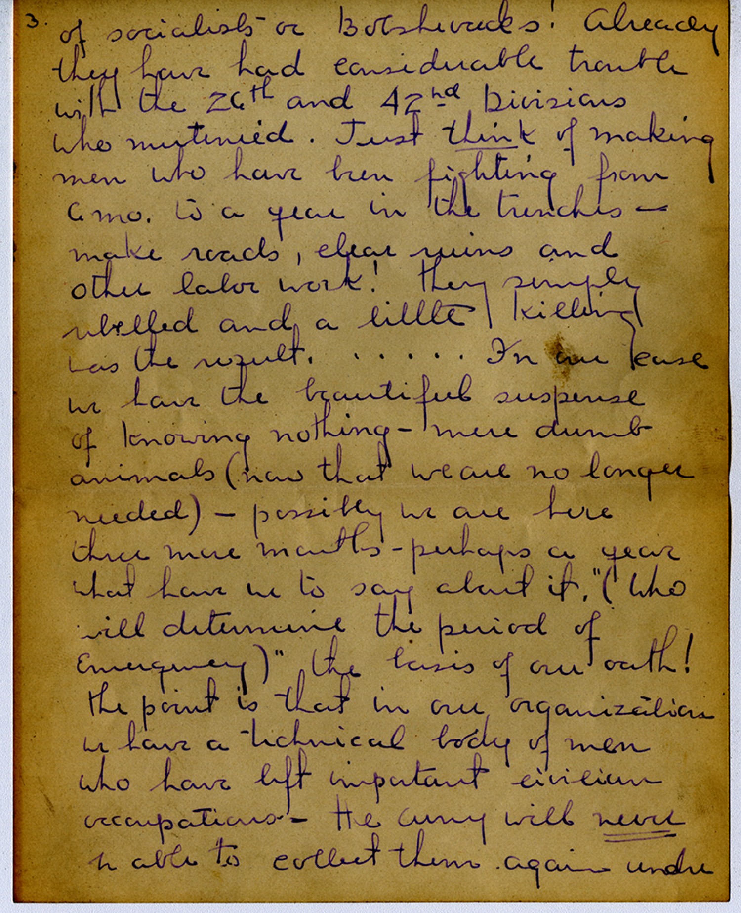 [page 3] of socialists or Bolshevicks! Already they have had considerable trouble with the 26th and 42nd Divisions who mutinied. Just think of making men who have been fighting from 6 mo. to a year in the trenches - make roads, clear ruins and other labor work! they simply rebelled and a little killing was the result. In our case we have the beautiful suspense of knowing nothing – mere dumb animals (now that we are no longer needed) – possibly we are here three more months – perhaps a year what have we to say about it. “ (Who will determine the period of Emergency)” the basis of our oath! the point is that in our organization we have a technical body of men who have left important civilian occupations – the army will never be able to collect them again under
