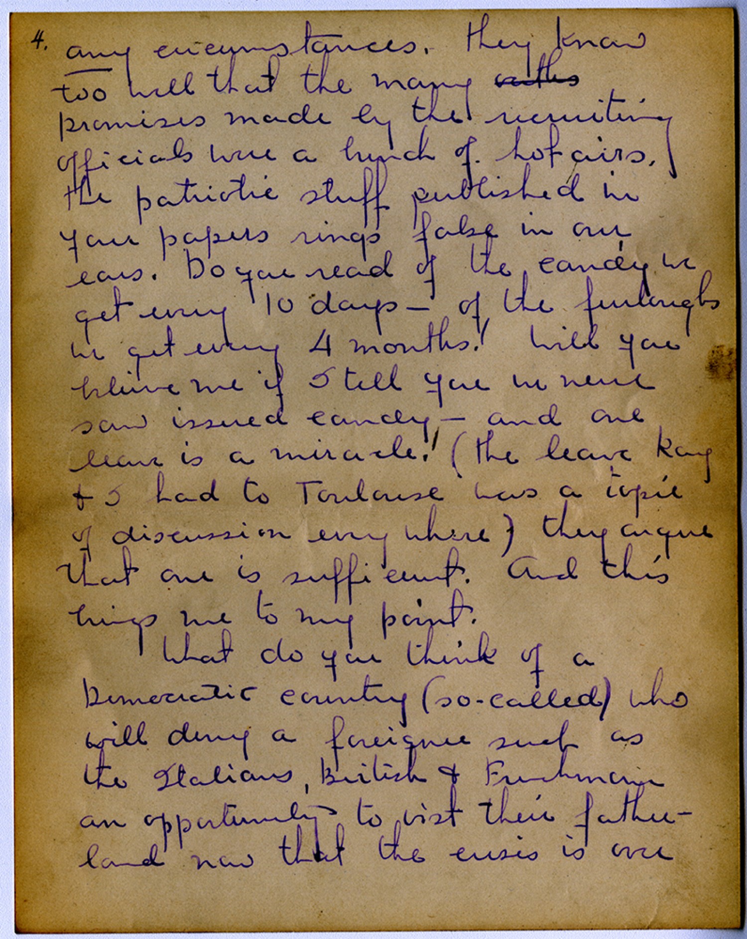 [page 4] any circumstances. they know too well that the many promises made by the recruiting officials were a bunch of hot airs. the patriotic stuff published in your papers rings false in our ears. Do you read of the candy we get every 10 days – of the furloughs we get every 4 months! Will you believe me if I tell you we never saw issued candy – and one leave is a miracle! (the leave Ray & I had in Toulouse was a topic of discussion everywhere) they argue that one is sufficient. And this brings me to my point. What do you think of a Democratic country (so-called) who will deny the foreigner such as the Italians, British & Frenchman an opportunity to visit their fatherland now that the crisis is over