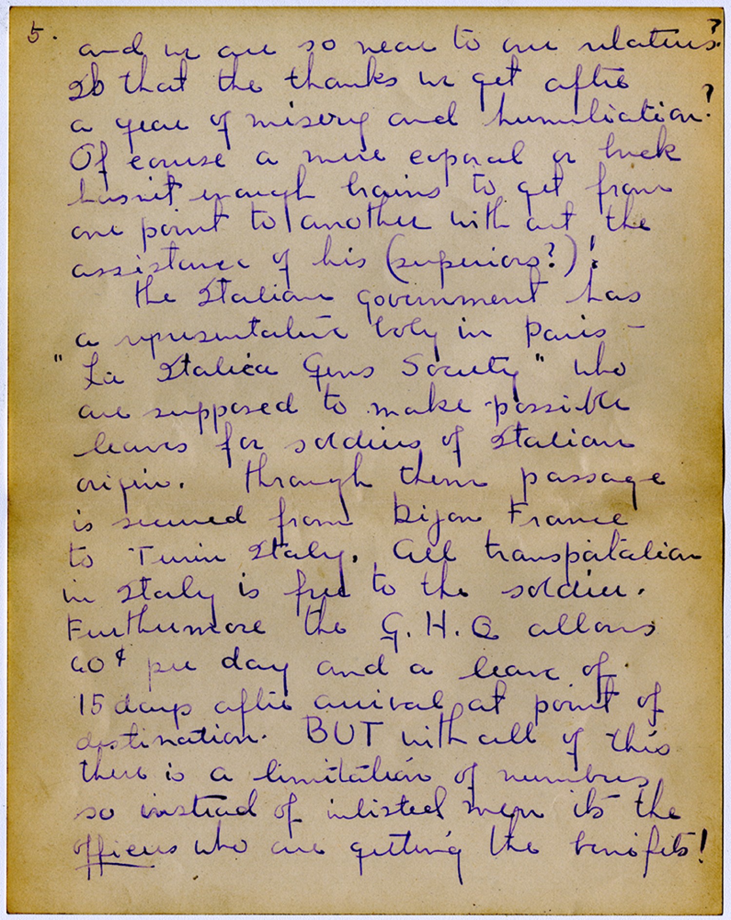 [page 5] and we are so near to our relatives? Is that the thanks we get after a year of misery and humiliation? Of course a mere corporal or buck hasn’t enough brains to get form one point to another with out the assistance of the (superiors?)! The Italian government has a representative body in Paris – “La Italica gens Society” who are supposed to make possible leaves for soldiers of Italian origin. through them passage is secured from Dijon France to Turin Italy. All transportation in Italy is free to the soldier. Furthermore the g.H.Q allows 60 [cents] per day and a leave of 15 days after arrival at point of destination. BUT with all of this there is a limitation of numbers so instead of inlisted men it is the officers who are getting the benefits!