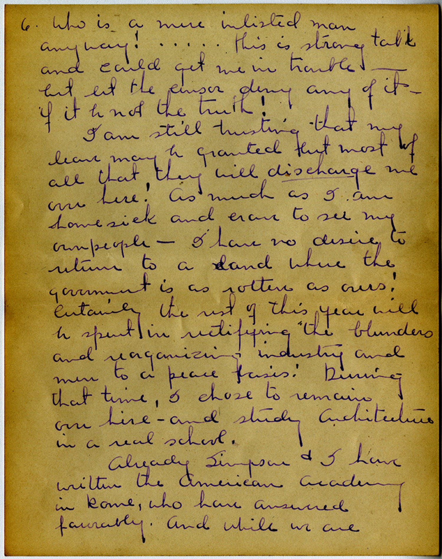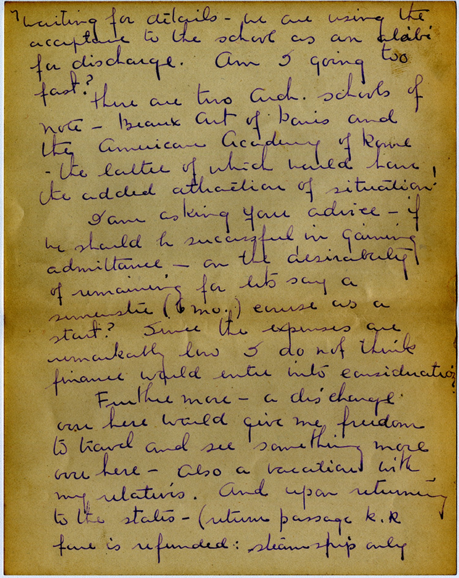 [page 7] waiting for details – we are using the acceptance to the school as an alibi for discharge. Am I going too fast? there are two [Architecture] schools of note – Beaux Art of Paris and the American Academy of Rome – the latter of which would have the added attraction of situation! I am asking your advice – if we should be successful in gaining admittance –on the desirablity of remaining for lets say a semester (6 mo.) course as a start? Since the expenses are remarkably low I do not think finance would enter into consideration. Furthermore - a discharge over here would give me freedom to travel and see something more over here – also a vacation with my relatives. And upon return to the states – (return passage R.R. fare is refunded: steamship only