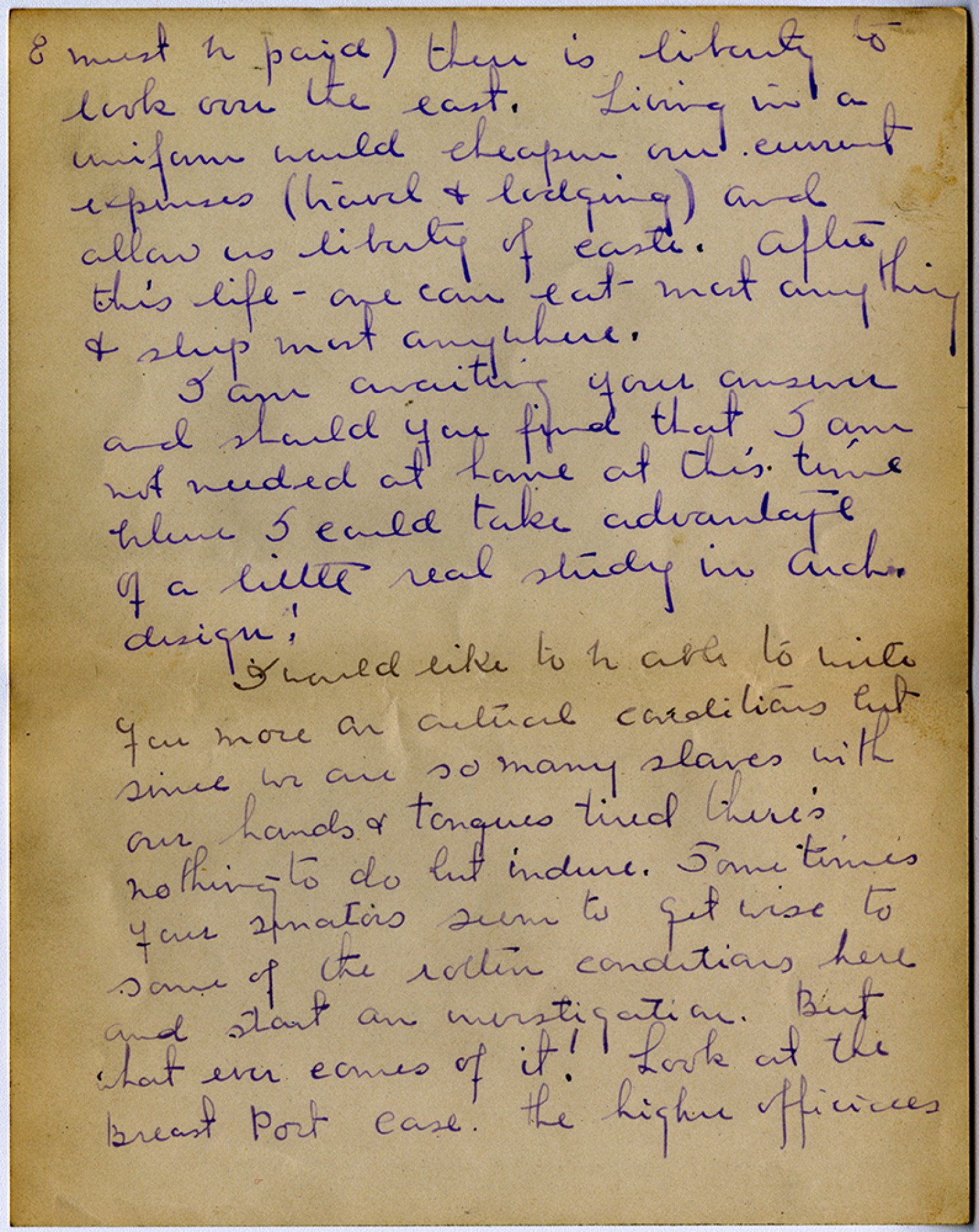 [page 8] must be paid) there is liberty to look over the east. Living in a uniform would cheapen our current expenses (travel & lodging) and allow us liberty of caste. After this life – one can eat most anything & sleep most anywhere. I am awaiting you answer and should you find that I am not needed at home at this time believe I could take advantage of a little real study in [Architecture] design! I would like to be able to write you more on actual conditions but since we are so many slaves with our hands &tongues tied there’s nothing to do but indure. Sometimes your senator’s seem to get wise to some of the rotten conditions here and start an investigation. But what ever comes of it! Look at the Breast Port Case. the higher officers