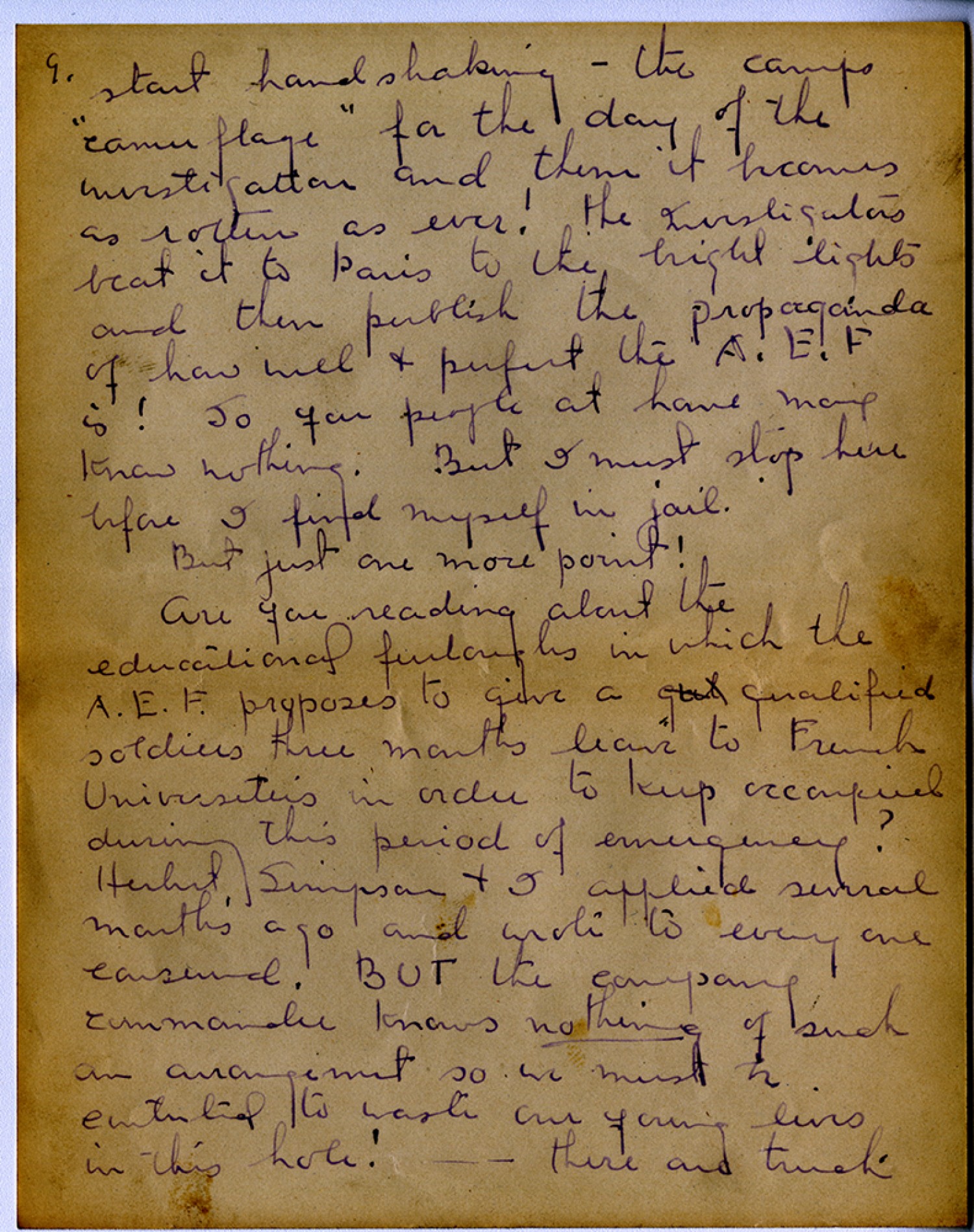 [page 9] start handshaking – the camps “camuflage” for the day of the investigation and then it becomes as rotten as ever! the investigators beat it to Paris to the bright lights and then publish the propaganda of how well & perfect the A.E.F. is ! So you people at home may know nothing. But I must stop here before I find myself in jail. But just one more point! Are you reading about the educational furloughs in which the A.E.F. proposes to give a qualified soldier three months leave to French Universities in order to keep occupied during this period of emergency? Herbert, Simpson & I applied several months ago and wrote to every one concerned. BUT the company commander knows nothing of such an arrangement so we must be contented to waste our young lives in this hole! – there are trench
