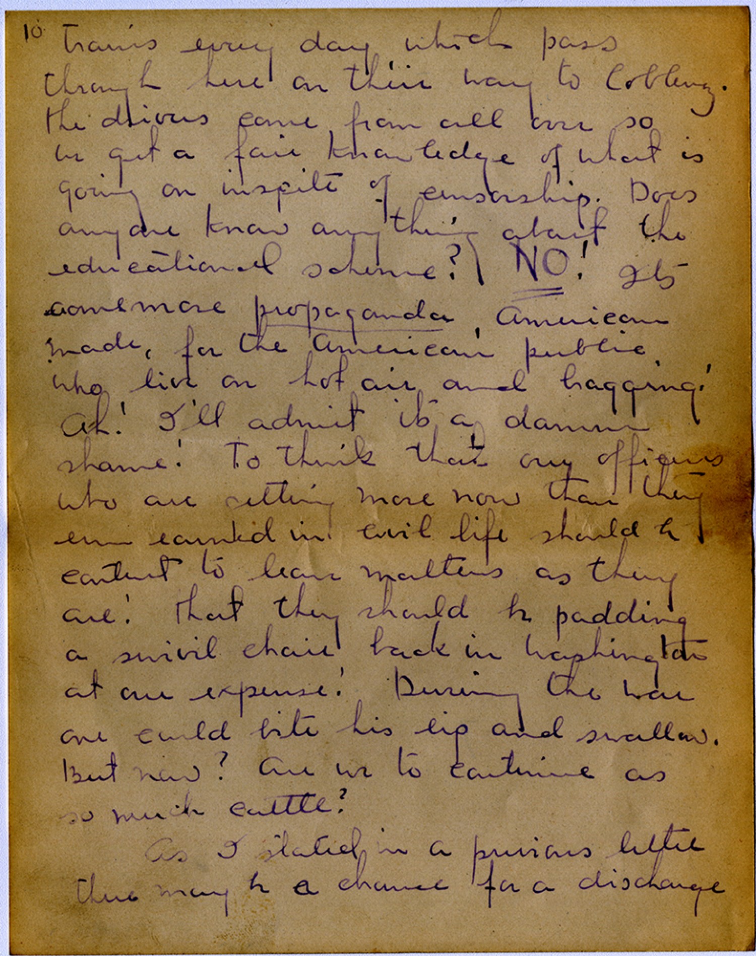 [page 10] Trains every day which pass through here on their way to Coblenz. the divisions come from all over so we get a fair knowledge of what is going on inspite of censorship. Does anyone know anything about the educational scheme? NO! Its some more propaganda, American made, for the American public whom live on hot air and bragging ah! I’ll admit its a damn shame! To think that our officers who are getting more now than they ever earned in civil life should be content to leave matters as they are! That they should be padding a swivel chair back in Washington at our expense! During the war one could bite his lip and swallow. But now? Are we to continue as so much cattle? As I stated in a previous letter there may be a chance for a discharge