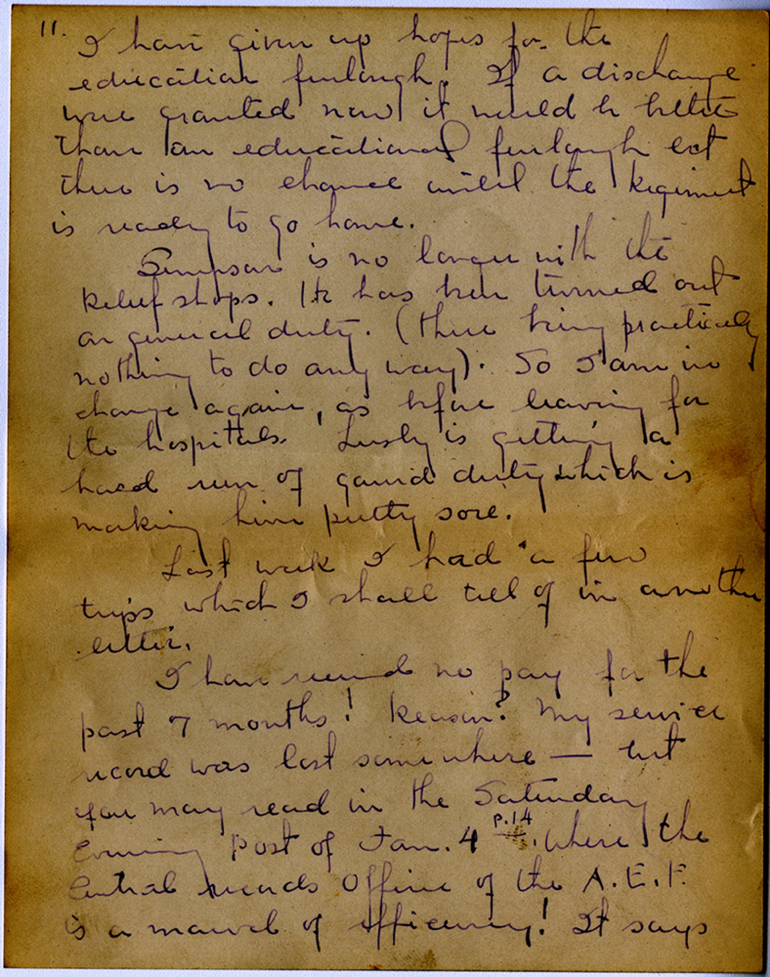 [page 11] I have given up hopes for the educational furlough. If a discharge were granted now it would be better than an educational furlough ect there is no chance until the regiment is ready to go home. Simpson is no longer with the Relief shops. He has been turned out on general duty. (there being practically nothing to do anyway). So I am in charge again, as before leaving for the hospitals. Lusly is getting a hard run of gaurd duty which is making him pretty sore. Last week I had a few trips which I shall tell of in another letter. I have received no pay for the past 7 months! Reason? My service record was lost somewhere – but you may read in the Saturday Evening Post of [January] 4 p. 14, where the Central records office of the A.E.F. is a marvel of efficiency! It says