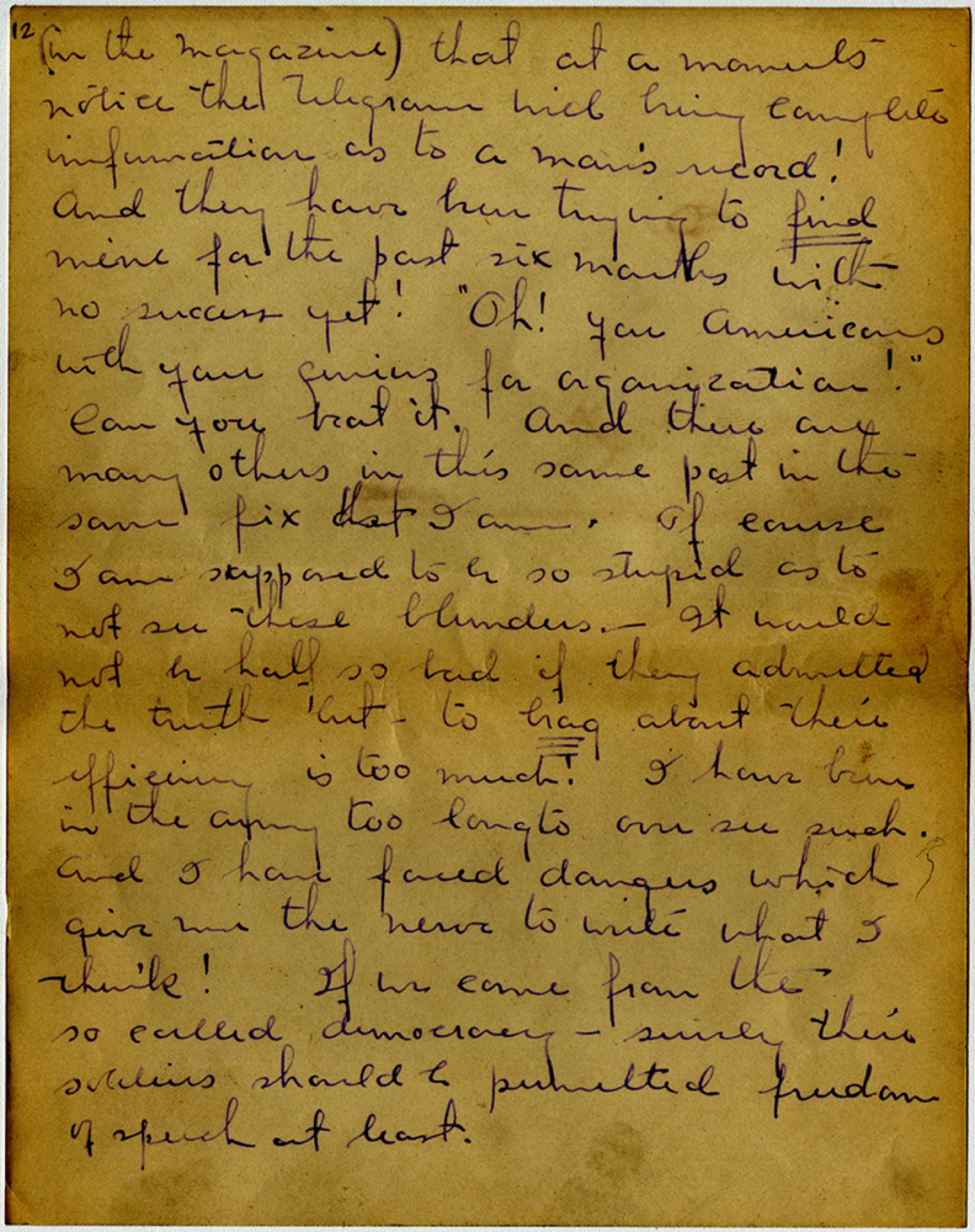 [page 12] (in the magazine) that at a moments notice the telegram will bring complete information as to a man’s record! And they have been trying to find mine for the past six months with no success yet! “Oh! you Americans with your genius for organization!” Can you beat it. And there are many others in this same post in the same fix I am. Of course I am supposed to be so stupid as to not see these blunders. - It would not be half so bad if they admitted the truth but to brag about their efficiency is too much! I have been in the army too long to ever see such. And I have faced dangers which give me the nerve to write what I think! If we come from the so called democracy – surely their soldiers should be permitted freedom of speech at least.