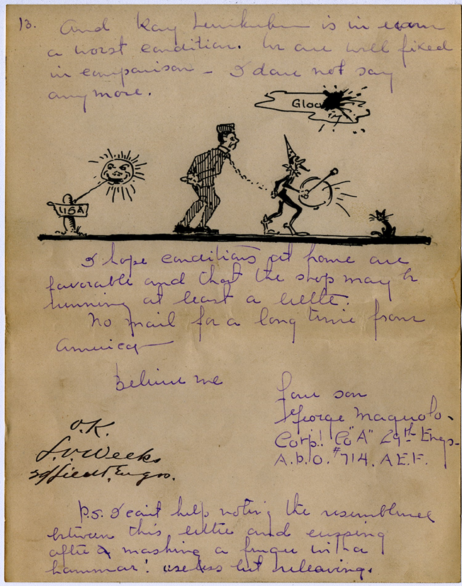 [page 13] and Ray Leunkebin is in a worst condition. We are well fixed in comparison – I dare not say anymore. [sketch of Uncle Sam walking with a soldier behind him who has a leash on his neck] I hope conditions at home are favorable and that the shop may be running at least a little. No mail for a long time from America – Believe me your son George Maguolo [Corporal] Co “A” 29th [Engineers] A.P.O. #714 A.E.F. [censor’s signature] P.S. I can’t help noting the resemblence between this letter and cussing after mashing a finger in a hammar! useless but releaving.