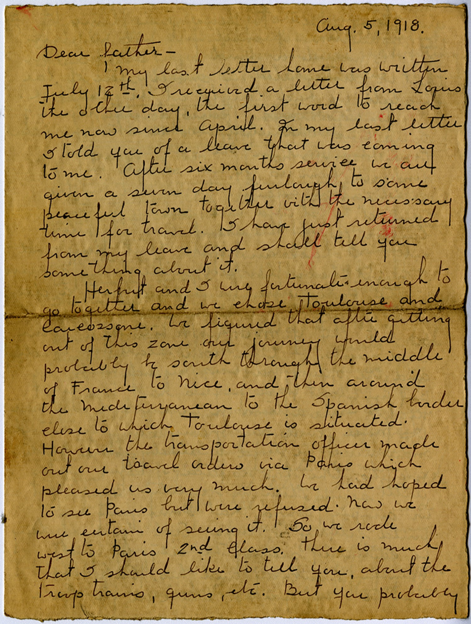 [August] 5, 1918. Dear father - My last letter home was written July 12th. I received a letter from Louis the other day, the first word to reach me now since April. In my last letter I told you of a leave that was coming to me. After six months service we are given a seven day furlough to some peaceful town together with the necessary time for travel. I have just returned from my leave and shall tell you something about it. Herbert and I were fortunate enough to go together and we chose Toulouse and [Carcassonne]. We figured that after getting out of this zone our journey would probably be south through the middle of France to Nice, and then around the Mediterranean to the Spanish border close to which Toulouse is situated. However the transportation officer made out our travel orders via Paris which pleased us very much. We had hoped to see Paris but were refused. Now we were certain of seeing it. So we rode west to Paris 2nd Class. there is much that I should like to tell you, about the Troop Trains, guns, etc. But you probably