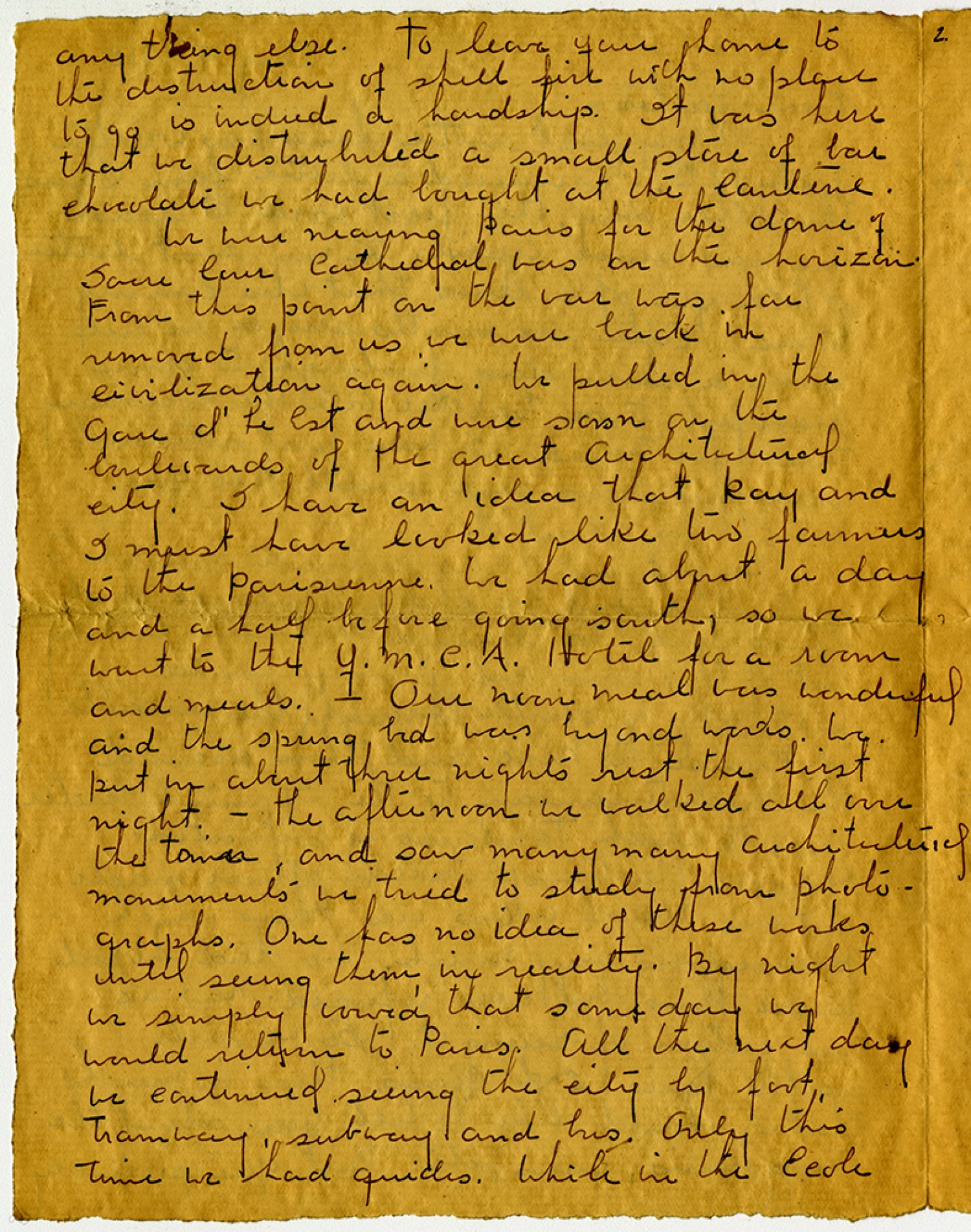 anything else. To leave your home to the destruction of shell fire with no place to go is indeed a hardship. It was here that we distributed a small store of bar chocolate we had bought at the cantine. We were nearing Paris for the dome of [ms illegible: 2 wds] Cathedral was on the horizon. From this point on the war was far removed from us we were back in civilization again. We pulled in the gare d’ Le Est and were soon on the boulevards of the great Architectural city. I have an idea that Ray and I must have looked like two farmers to the [Parisian]. We had about a day and a half before going south, so we went to the Y. M. C. A. Hotel for a room and meals. Our noon meal was wonderful and the spring bed was beyond words. We put in about three nights rest the first night – the afternoon we walked all over the town, and saw many architectural monuments we tried to study from photographs. One has no idea of these works until seeing them in reality. By night we simply vowed that some day we would return to Paris. All the next day we continued seeing the city by foot. Tramway, subway and bus. Only this time we had guides. While in the Ecole