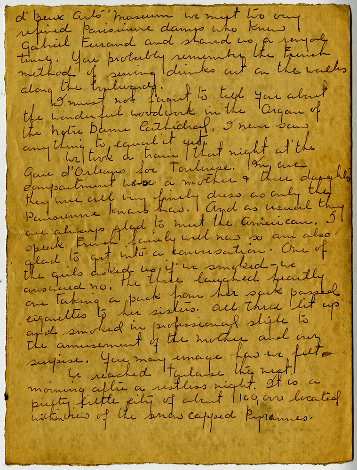 d’ Beux Arts Museum we met two very refined [Parisian] dames who knew gabriel Ferrand and showed us a royal time. You probably remember the French method of serving drinks out on the walks along the boulevards. I must not forget to tell you about the wonderful woodwork in the Organ of the Notre Dame Cathedral. I never saw anything to equal it yet. We took a train that night at the gare d’Orleans for Toulouse. In our compartment was a mother & three daughters they were all very finely dress as only the [Parisian] knows how. And as usual they are always glad to meet the American. I speak French fairly well now so am also glad to get into a conversation. One of the girls asked us if we smoked – we answered no. The three laughed heartly one taking a pack from her sack passed cigarettes to her sisters. All three lit up and smoked in professional style to the amusement of the mother and our surprise. You may image how we felt. We reached Toulouse the next morning after a restless night. It is a pretty little city of about 160,000 located within view of the snow capped [Pyrenees].