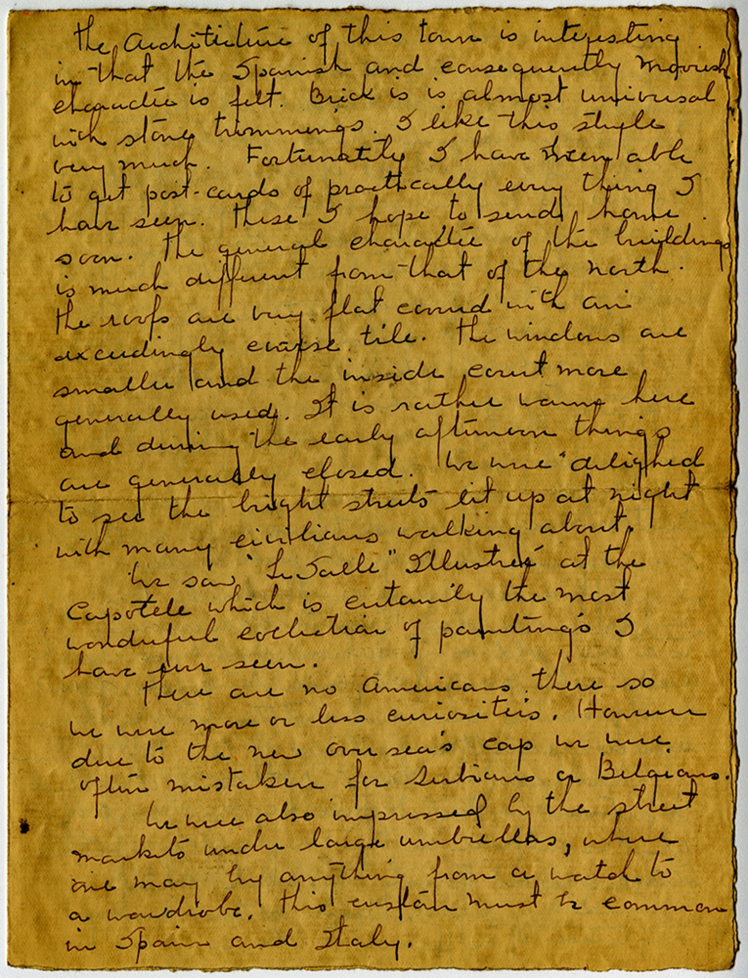 The architecture of this town is interesting in that the Spanish and consequently Moorish character is felt. Brick is is almost universal with strong trimmings. I like this style very much. Fortunately I have been able to get postcards of practically every thing I have seen. These I hope to send home soon. The general character of the buildings is much different from that of the North. The roofs are very flat covered with an exceedingly course tile. The windows are smaller and the inside court more generally used. It is rather warm here and during the early afternoon things are generally closed. We were delighted to see the bright streets lit up at night with many civilians walking about. We saw “Le Salle” Illustree at the Capotele which is certainly the most wonderful collection of paintings I have ever seen. There are no Americans there so we were more or less curiosities. However due to the new oversea’s cap we were often mistaken for Serbians or Belgians. We were also impressed by the street markets under large umbrellas, where one may buy anything from a watch to a wardrobe. This custom must be common in Spain and Italy.