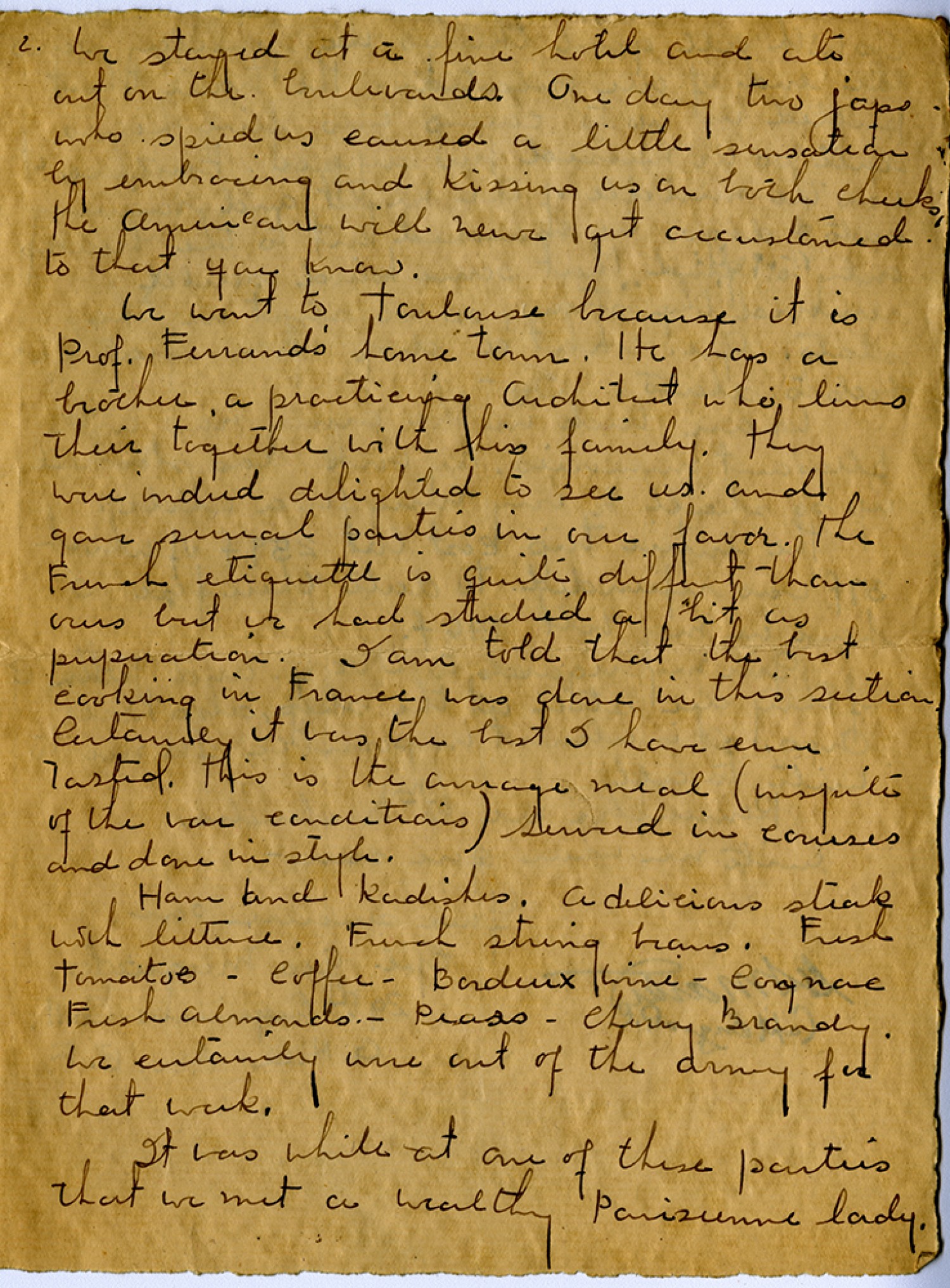 2. We stayed at a fine hotel and ate out on the boulevards. One day two japs who spied us caused a little sensation by embracing and kissing us on both cheeks. The American will never get accustomed to that you know. We went to Toulouse because it is Prof. Ferrand’s home town. He has a brother, a practicing architect who lives their together with his family. They were indeed delighted to see us and gave several parties in our favor. The French etiquette is quite different than ours but we had studied a bit as preperation. I am told that the best cooking in France was done in this section. Certainly it was the best I have ever tasted. This is the average meal (inspite of the war conditions) Served in courses done in style. Ham and Radishes, a delicious steak with lettuce. French string beans. Fresh tomatoes – coffee – Bordeaux Wine – Cognac Fresh almonds – Peas – Cherry Brandy. We certainly were out of the army for that week. It was while at one of these parties that we met a wealthy [Parisian] lady.