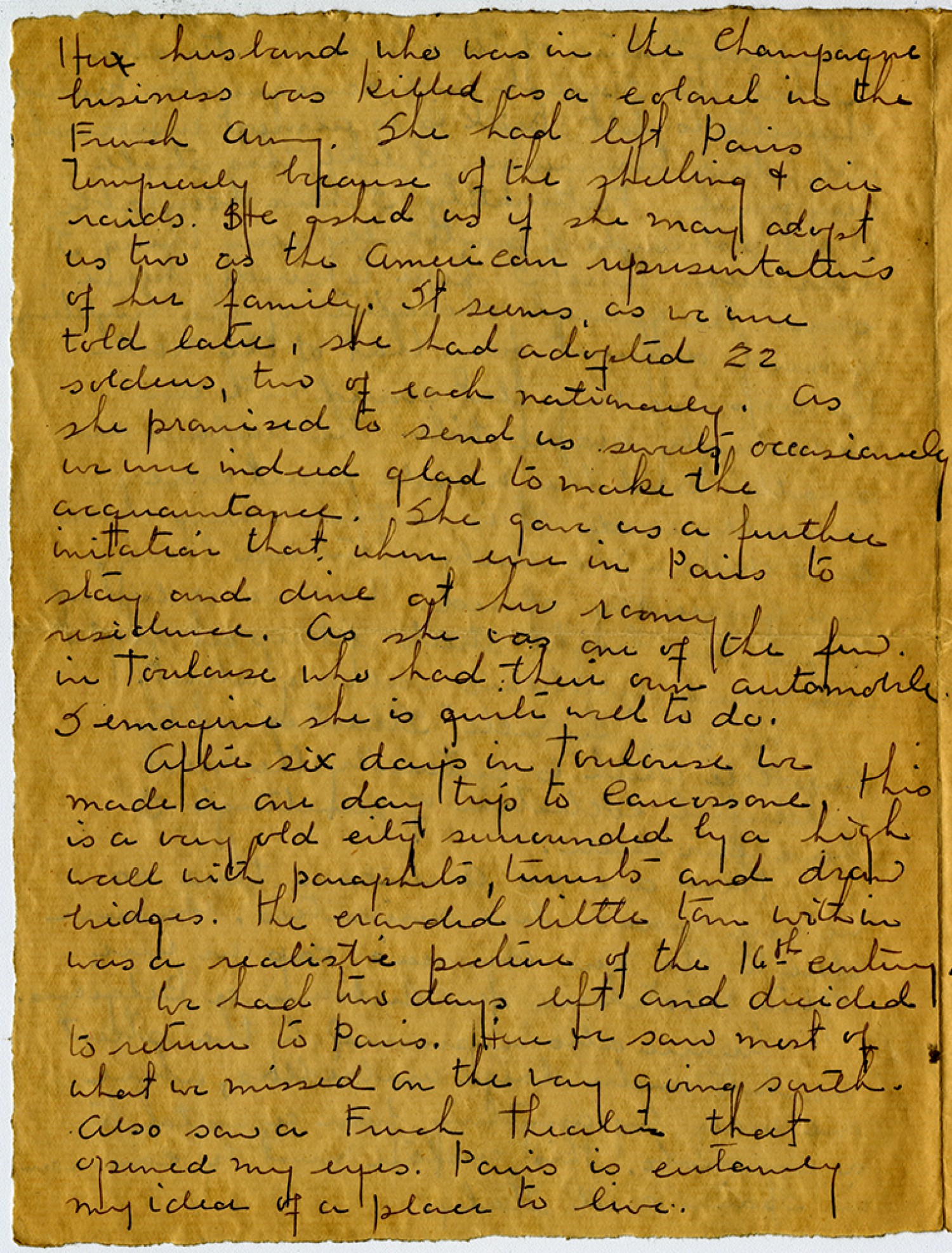 Her husband who was in the Champagne business was killed as a colonel in the French Army. She had left Paris temporarily because of the shelling & air raids. She asked us if she may adopt us two as the American representatives of her family. It seems, as we were told later, she had adopted 22 soldiers, two of each nationality. As she promised to send us sweets occasionally we were indeed glad to make the acquaintance. She gave us a further invitation that when ever in Paris to stay and dine at her roomy residence. As she was one of the few in Toulouse who had their own automobile. I imagine she is quite well to do. After six days in Toulouse we made a one day trip to [Carcassonne], this is a very old city surrounded by a high wall with paraphets, tunnels and draw bridges. The crowded little town within was a realistic picture of the 16th century. We had two days left and decided to return to Paris. Here we saw most of what we missed on the way going south. Also saw a French Theater that opened my eyes. Paris is certainly my idea of a place to live.