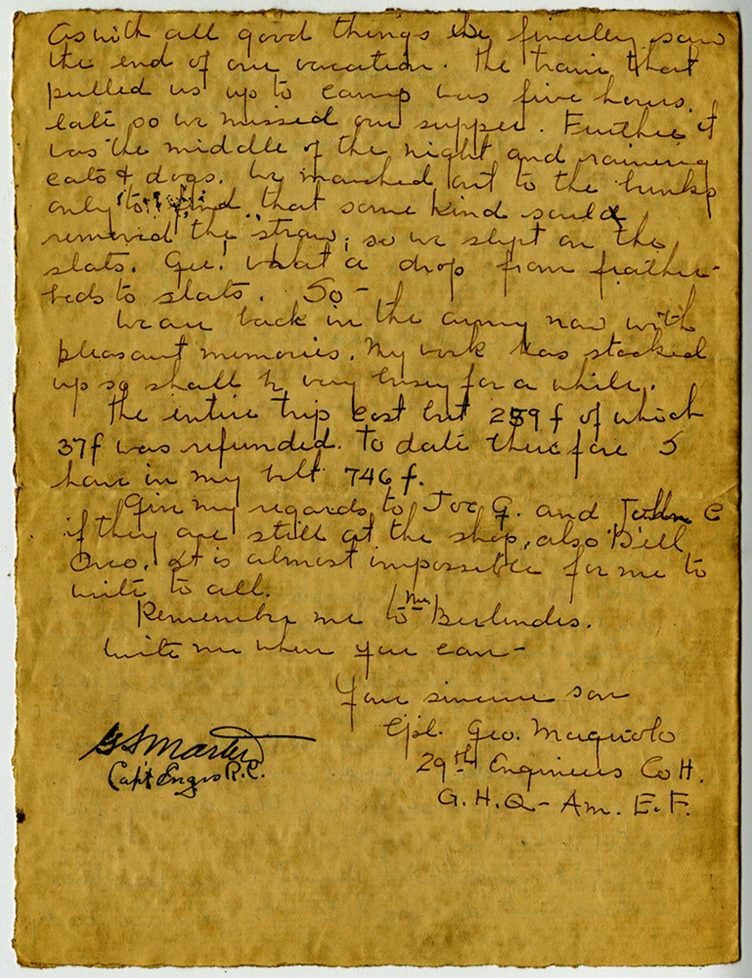 As with all good things we finally saw the end of our vacation. The train that pulled us up to camp was five hours late so we missed our supper. Further it was the middle of the night and raining cats & dogs. We marched out to the bunks only to find that some kind soul removed the straw; so we slept on the slats. gee! what a drop from feather beds to slats. So - we are back in the army now with pleasant memories. My work has stacked up so shall be very busy for a while. The entire trip cost but 259 [francs] of which 37 [francs] was refunded. To date therefore I have in my belt 746 [francs]. give my regards to Joe g. and John C if they are still at the shop, also Dill Oreo. It is almost impossible for me to write to all. Remember me to Mr. Berlendes. Write me when you can – Your sincere son [Corporal] [George] Maguolo 29th Engineers Co. H. [General Headquarters] [American Expeditionary Forces] [censor signature]