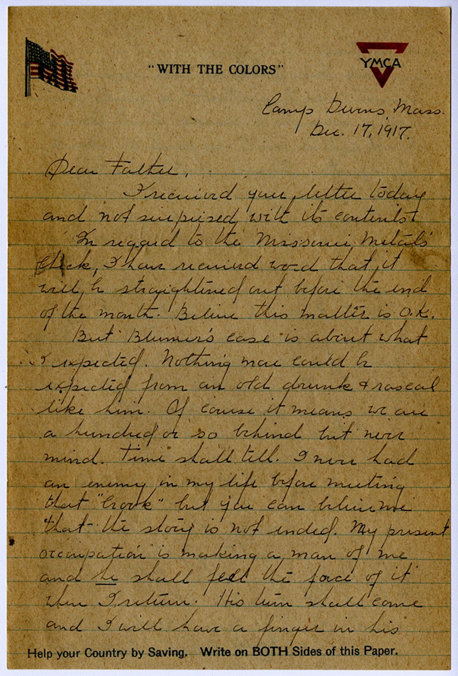 Camp Devens, [Massachusetts] [December ] 17, 1917 Dear Father, I received your letter today and not surprised with its contents. In regard to the Missouri Metal’s check, I have received word that it will be straightened out before the end of the month. Believe this matter is O.K. But Blumer’s case is about what I expected. Nothing more could be expected from an old drunk and rascal like him. Of course it means we are a hundred or so behind but [never] mind. Time shall tell. I [never] had an enemy in my life before meeting that “Crook” but you can believe me that the story is not ended. My present occupation is making a man of me and he shall feel the force of it when I return. His turn shall come and I will have a finger in his