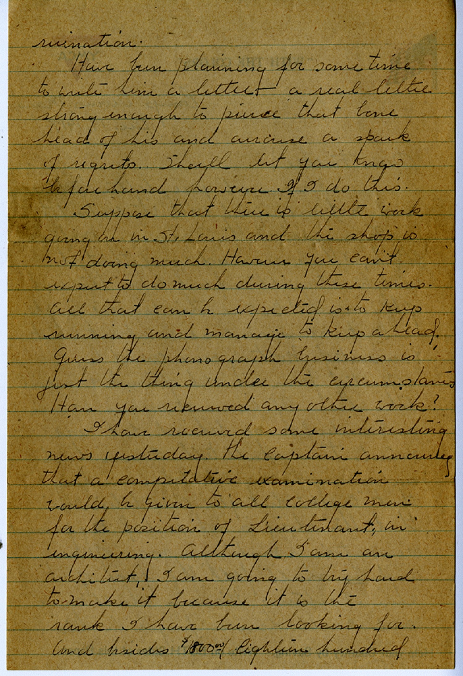 ruination. Have been planning for some time to write him a letter a real letter strong enough to pierce that bone head of his and arouse a spark of regrets. Shall let you know beforehand however. If I do this. Suppose that there is little work going on in St. Louis and the shop is not doing much. However you can’t expect to do much during these times. all that can be expected is to keep running and manage to keep ahead. guess the phonograph business is just the thing under the circumstances. Have you received any other work? I have received some interesting news yesterday. The Captain [announcing] that a competative examination would be given to all college men for the position of Lieutenant, in engineering. Although I am an architect, I am going to try hard to make it because it is the rank I have been looking for and besides $1800 Eighteen hundred