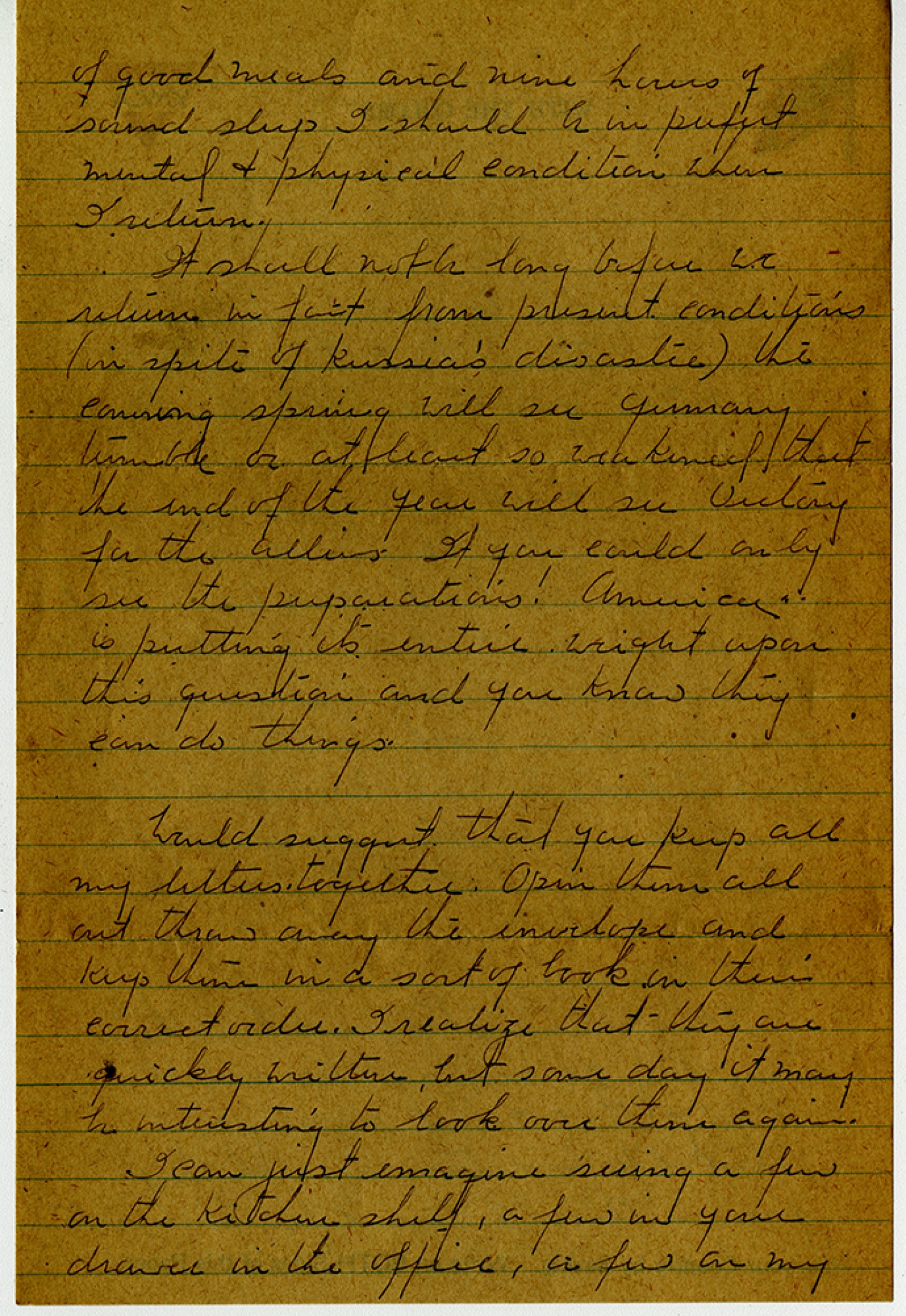 of good meals and nine hours of sound sleep I should be in perfect mental and physical condition when I return. It shall not be long before we return in fact from present conditions (in spite of Russia’s disaster) the coming spring will see germany tremble or at least so weakened that the end of the year will see victory for the allies. If you could only see the preparations! America is putting its entire weight upon this question and you know they can do things. Would suggest that you keep all my letters together. Open them all and throw away the envelope and keep them in a sort of book in their correct order. I realize that they are quickly written, but some day it may be interesting to look over them again. I can just imagine seeing a few on the kitchen shelf, a few in your drawer in the office, a few on my