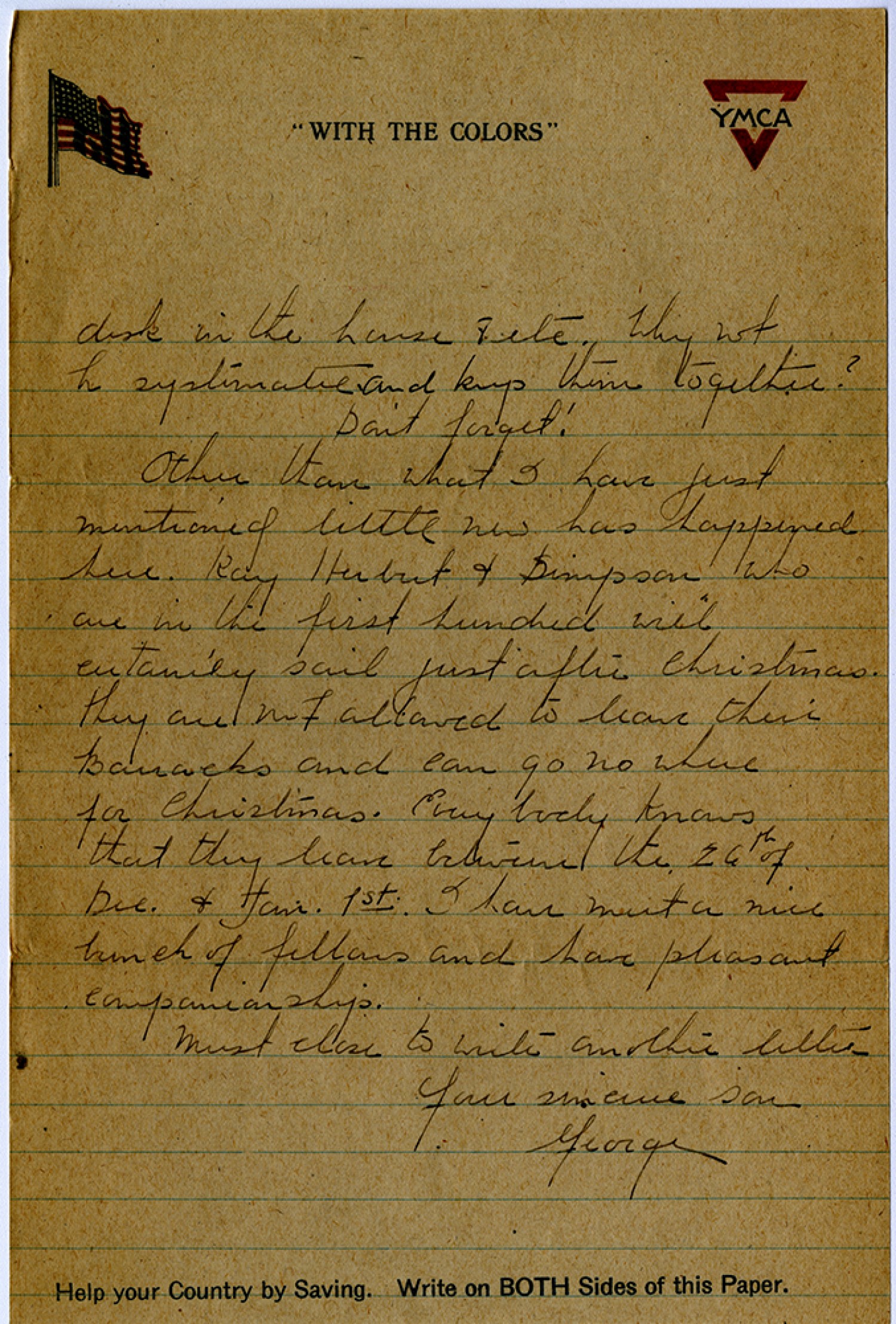 desk in the house & etc. Why not be systematic and keep them together? Don’t forget! Other than what I have just mentioned little news has happened here. Ray Herbert and Simpson who are in the first hundred will certainly sail just after Christmas. They are not allowed to leave their Barracks and can go no where for Christmas. Everybody knows that they leave between the 26th of [December] and [January] 1st. I have met a nice bunch of fellows and have pleasant companionship. Must close to write another letter Your sincere son George