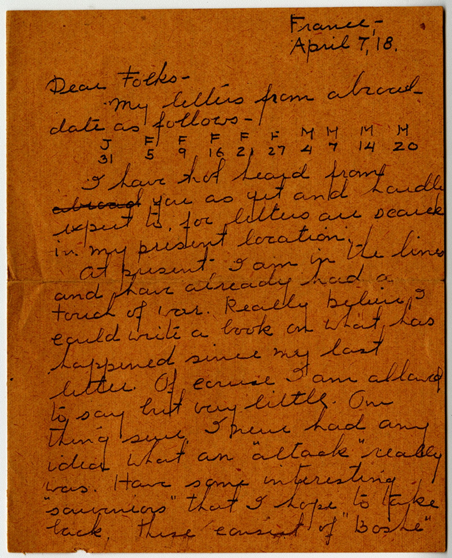 | Source | Maguolo, George J. Letter to Folks. 7 April 1918. George J. Maguolo Papers, 1917-1945. A0969. Missouri History Museum, St. Louis, Missouri. |