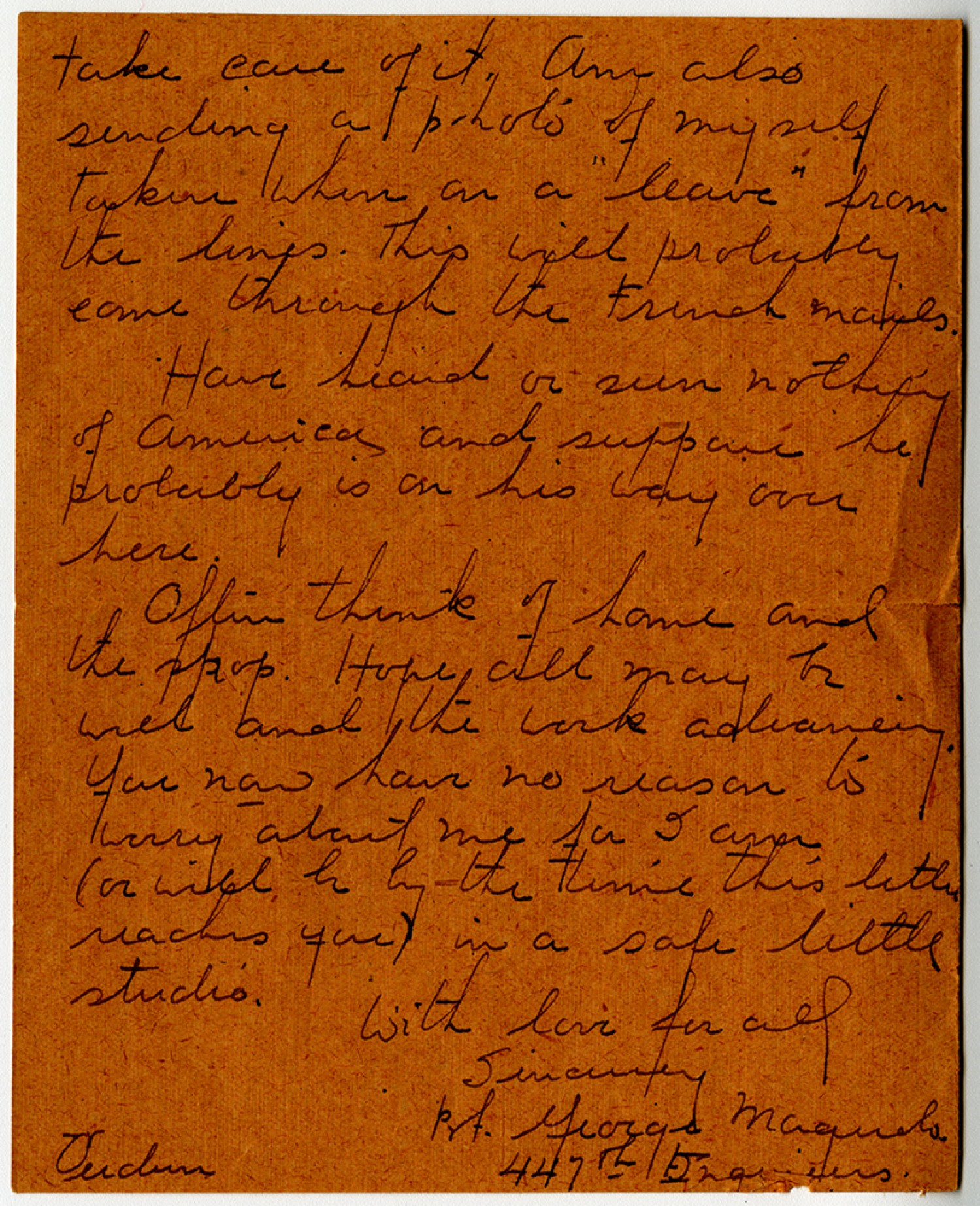 take care of it. Am also sending a photo of myself taken when on a “leave” from the lines. This will probably come through the French Mails. Have heard or seen nothing of America and suppose he probably is on his way over here. Often think of home and the shop. Hope all may be well and the work advancing. You now have no reason to worry about me for I am (or will be by the time this letter reaches you) in a safe little studio. With love for all Sincerely [Private] George Maguolo 447th Engineers Verdun