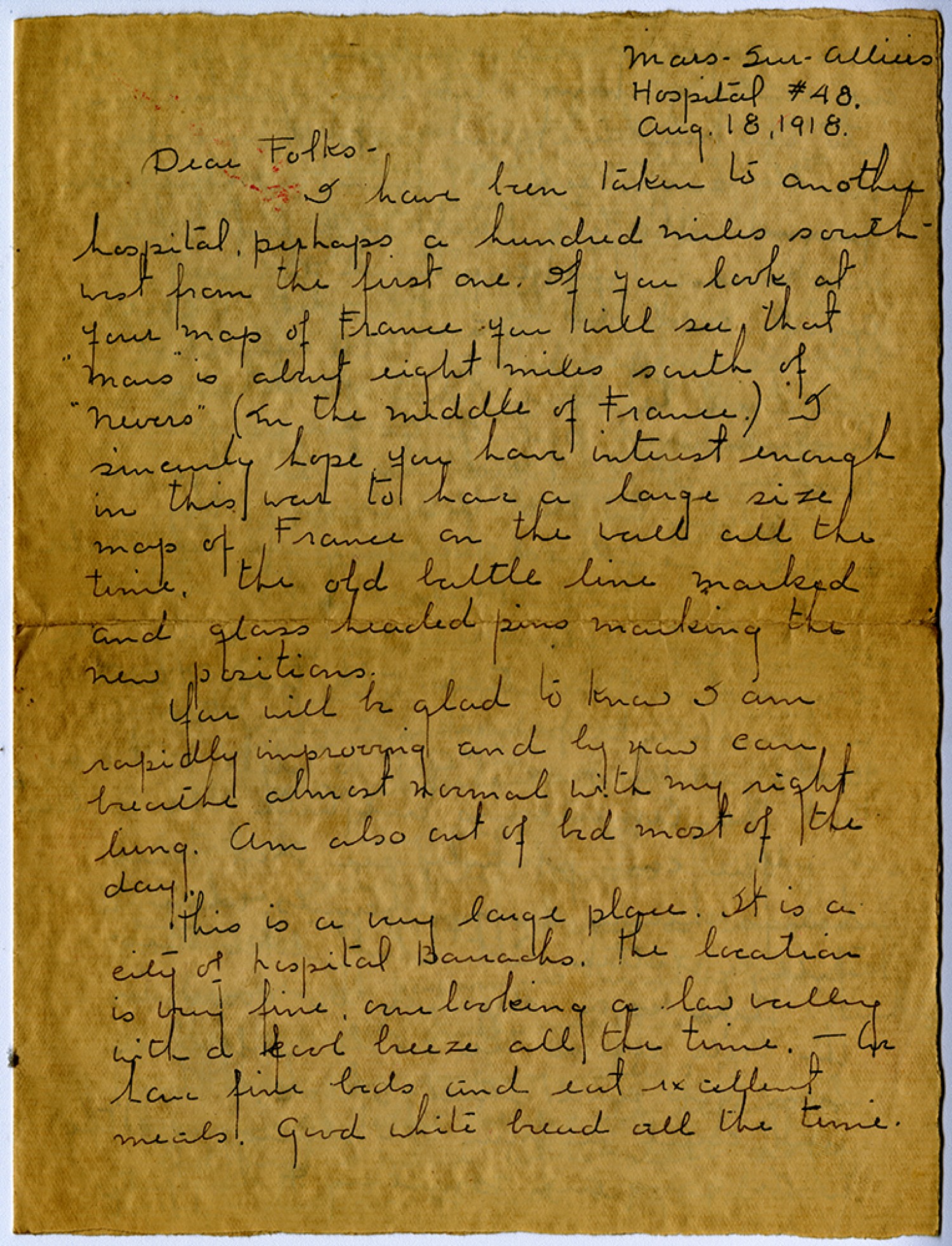 Mars-Sur-Alliers Hospital #48 [August] 18, 1918. Dear Folks – I have been taken to another hospital, perhaps a hundred miles southwest from the first one. If you look at your map of France you will see that “Mars” is about eight miles south of “Nevers” (in the middle of France.) I sincerely hope you have interest enough in this war to have a large size map of France on the wall all the time. the old battle line marked and glass headed pins marking the new positions. You will be glad to know I am rapidly improving and by now can breathe almost normal with my right lung. Am also out of bed most of the day. This is a very large place. It is a city of hospital barracks. The location is very fine, over looking a low valley with a cool breeze all the time. - We have fine beds and eat excellent meals. Good white bread all the time.