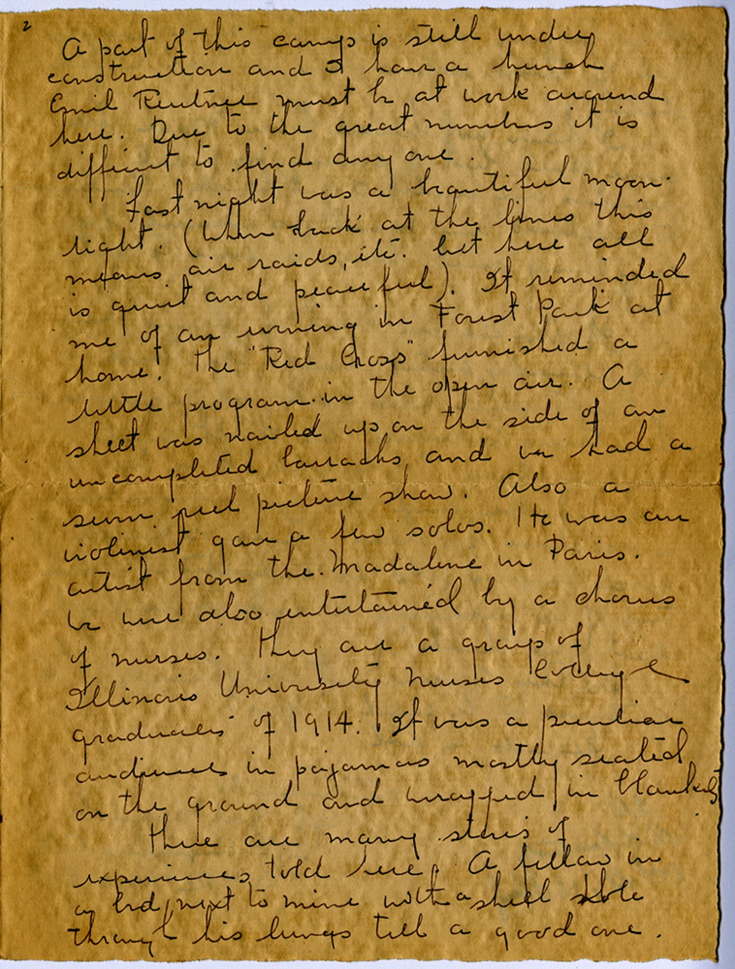 [page 2] A part of this camp is still under construction and I have a hunch Emil Reutner must be at work around here. Due to the great numbers it is difficult to find any one. Last night was a beautiful moon light. (When back at the lines this means air raids, etc. but here all is quiet and peaceful). It reminded me of an evening in Forest Park at home. The “Red Cross” furnished a little program in the open air. A sheet was nailed up on the side of an uncompleted barracks and we had a seven reel picture show. Also a violinist gave a few solos. He was an artist from the Madalene in Paris. We were also entertained by a chorus of nurses. They are a group of Illinois University nurses College graduates of 1914. It was a peculiar audience in pajamas mostly seated on the ground wrapped in blankets. There are many stories of experiences told here. A fellow in a bed next to mine with a shell through his lungs tells a good one.