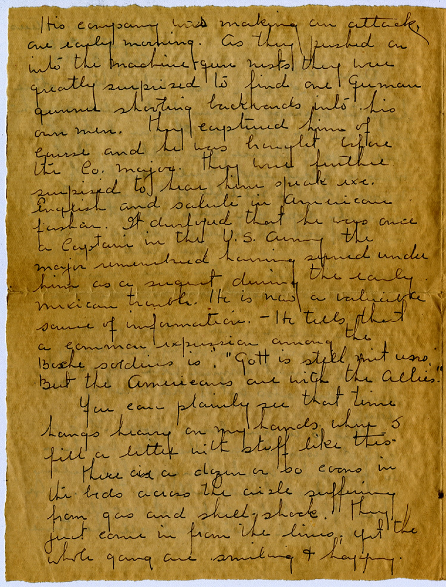 His company was making an attack, one early morning. As they pushed on into the machine gun nests they were greatly surprised to find one german gunner shooting backwards into his own men. They captured him of course and he was brought before the Co. Major. They were further surprised to hear him speak exc. English and salute in American fashion. It developed that he was once a Captain in the U. S. Army the major remembered having served under him as a sergeant during the early Mexican trouble. He is now a valuable source of information. - He tells that a common expression among the Bosche soldiers is. “Gott is still mit uno.” But the Americans are with the Allies.” You can plainly see that time hangs heavy on my hands when I fill a letter with stuff like this. There is a dozen or so coons in the beds across the aisle suffering from gas and shell-shock. They just come in from the lines, yet the whole gang are smiling & happy.