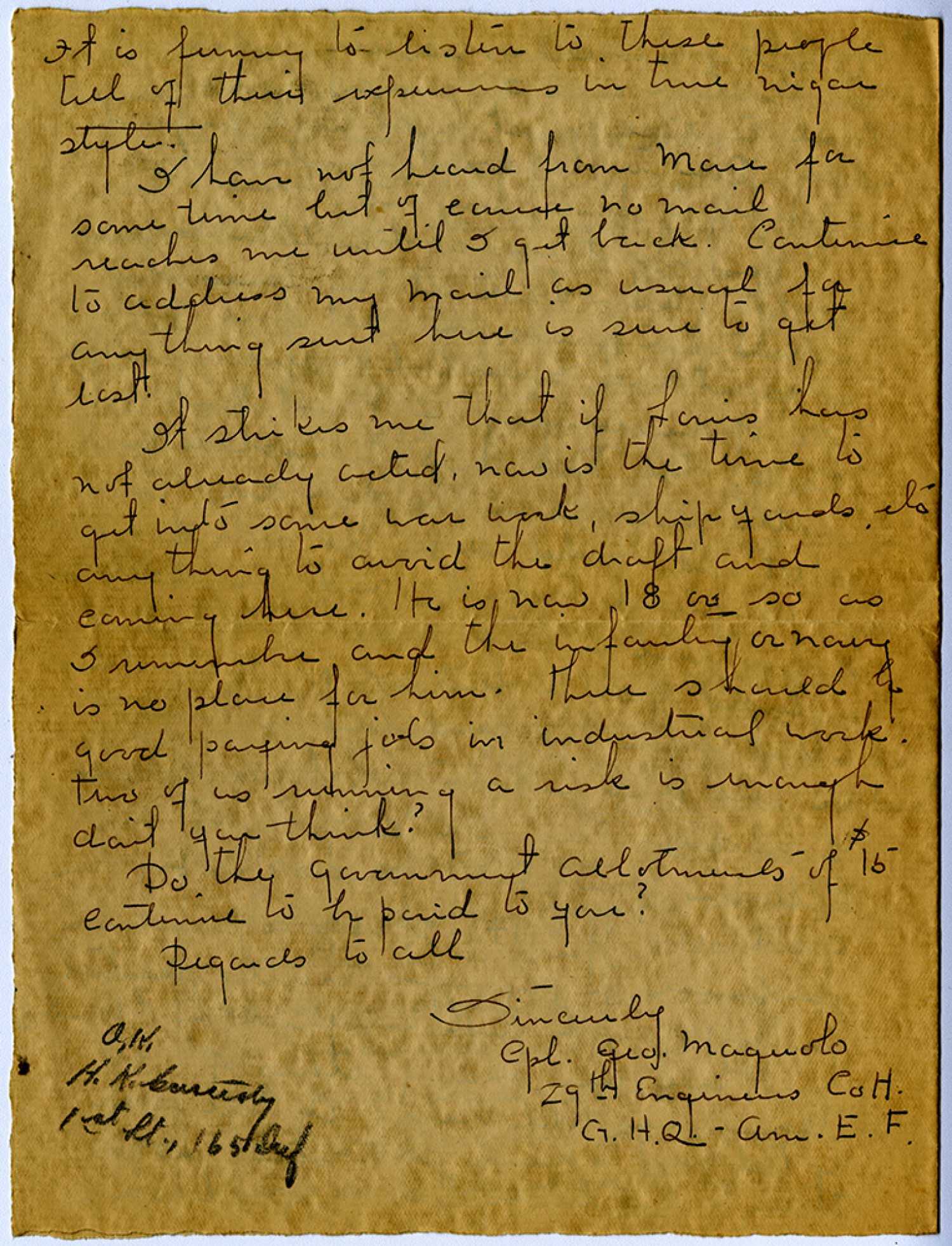 It is funny to listen to these people tell of there experiences in true nigar style. I have not heard from Marc for sometime but of course no mail reaches me until I get back. Continue to address my mail as usual for anything sent here is sure to get lost. It strikes me that if Louis has not already acted, now is the time to get into some war work, shipyards, etc. anything to avoid the draft and coming here. He is now 18 or so as I remember and the infantry or navy is no place for him. There should be good paying jobs in industrial work. Two of us running a risk is enough don’t you think? Do the government allotments of $15 continue to be paid to you? Regards to all Sincerely [Corporal] [George] Maguolo 29th Engineers Co. H. [General Headquarters] American Expeditionary Forces. [censors signature]