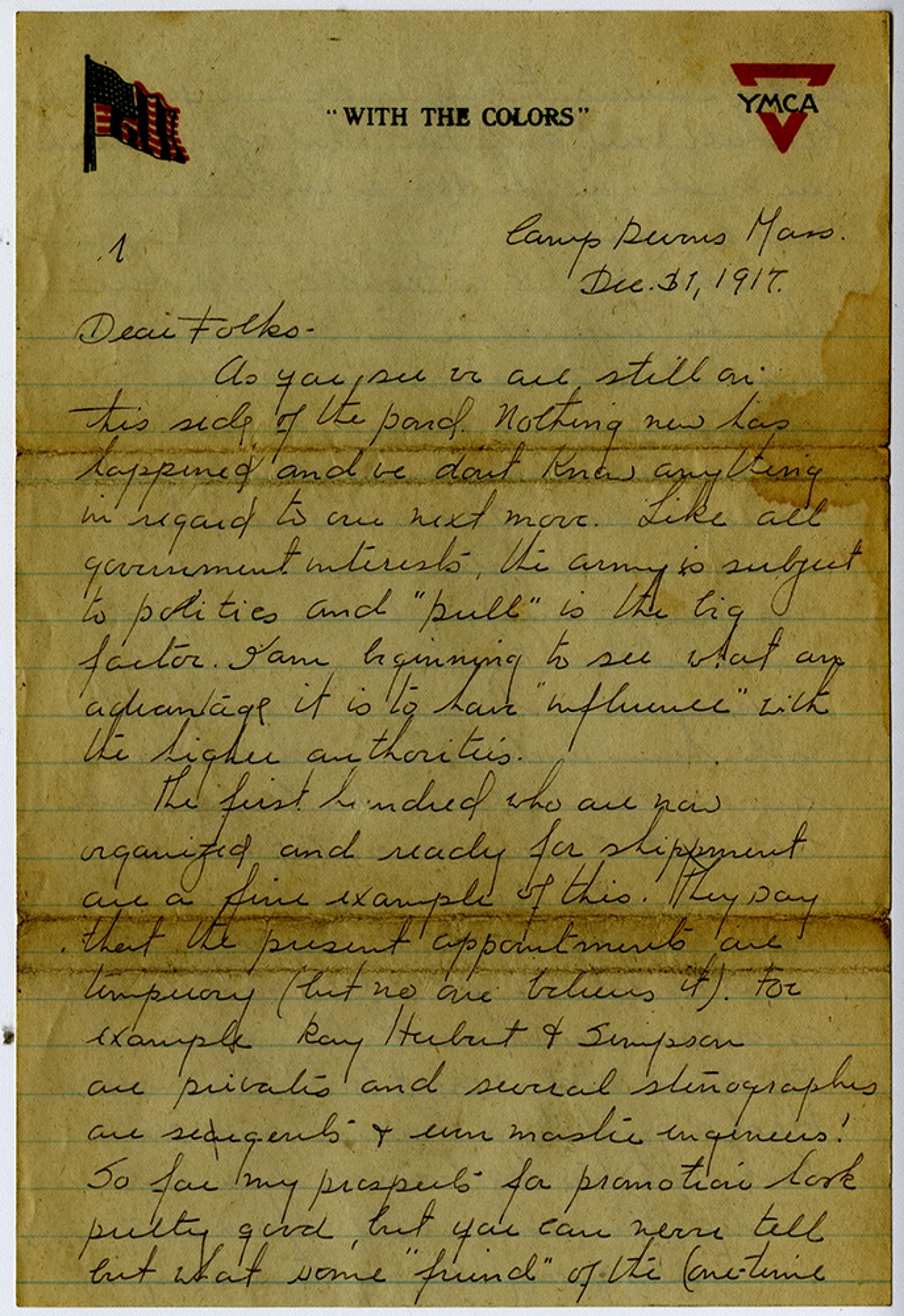 [page 1] Camp Devens, [Massachusetts] [December] 31, 1917 Dear Folks - As you see we are still on this side of the pond. Nothing new has happened and we dont know any thing in regard to our next move. Like all government interests the army is subject to politics and “pull” is the big factor. I am beginning to see what an advantage it is to have “influence” with the higher authorities. The first hundred who are now organized and ready for shipment are a fine example of this. They say that the present appointments are temporary (but no one believes it). For example Ray Herbert and Simpson are privates and several stenographers are sergeants & even master engineers! So far my prospects for promotion look pretty good, but you can never tell but what some “friend” of the (one-time