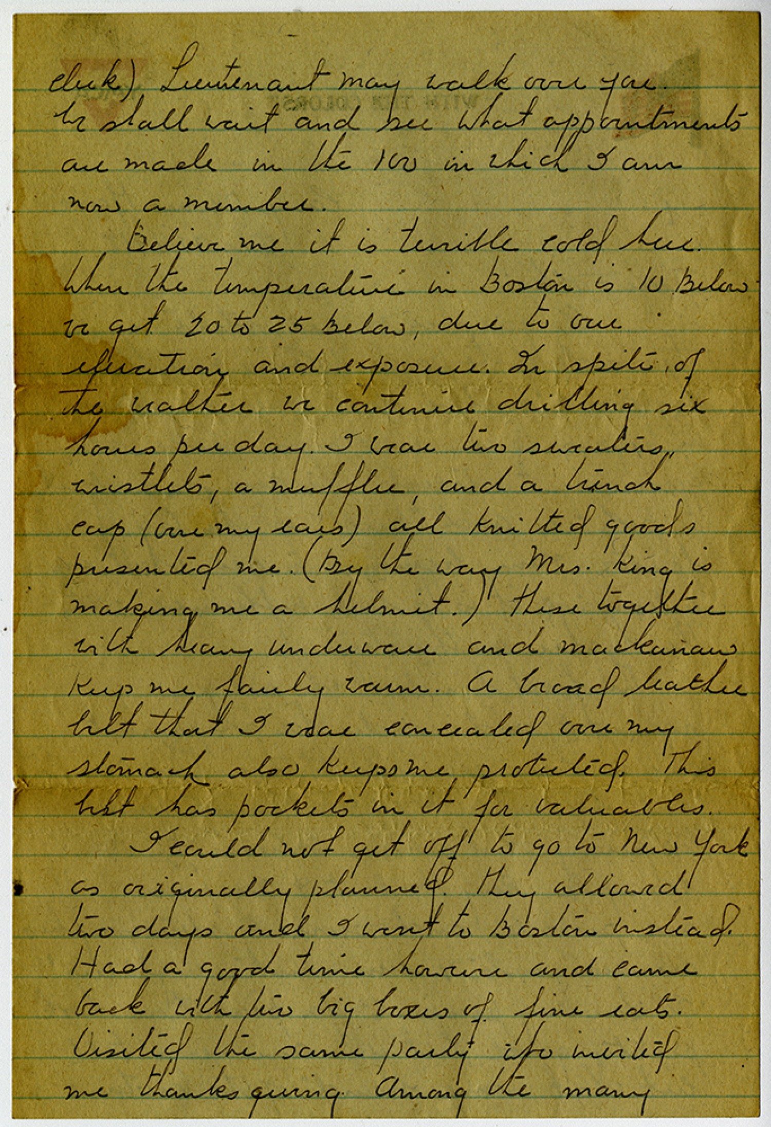 clerk) Lieutenant may walk over you. We shall wait and see what appointments are made in the 100 in which I am now a member. Believe me it is terrible cold here. When the temperature in Boston is 10 Below we get 20 to 25 Below, due to our elevation and exposure. In spite of the weather we continue drilling six hours per day. I wear two sweaters wristlets, a muffler, and a trench cap (over my ears) all knitted goods presented me. (By the way Mrs. King is making me a helmet.) These together with heavy underware and mackanaw keep me fairly warm. A broad leather belt that I wear concealed over my stomach also keeps me protected. This belt has pockets in it for valuables. I could not get off to go to New York as originally planned. They allowed two days and I went to Boston instead. Had a good time however and came back with two big boxes of fine eats. Visited the same party who invited me thanksgiving Among the many