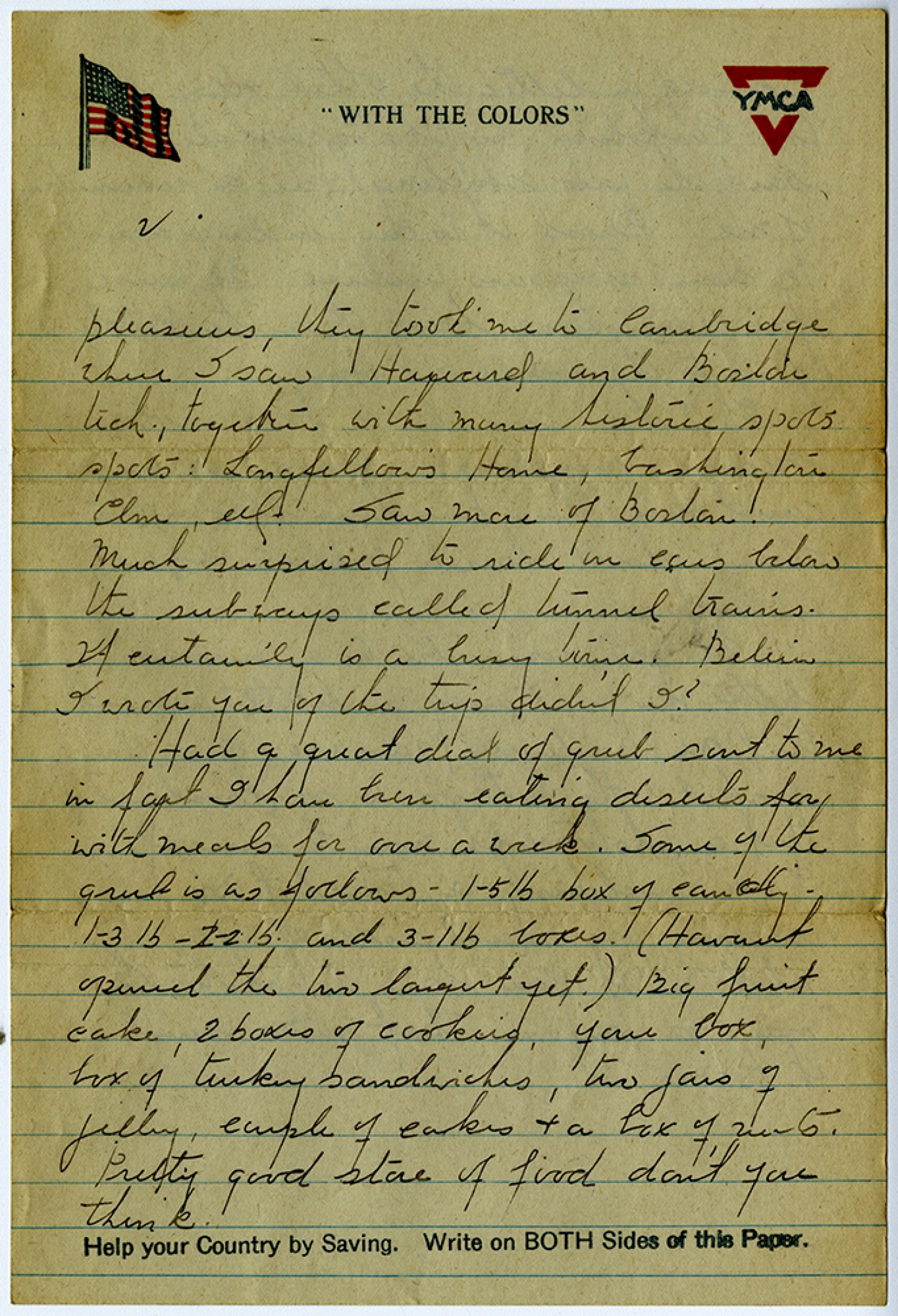 [page 2] pleasures, they took me to Cambridge there I saw Harvard and Boston tech, together with many historic spots spots: Longfellows Home, Washington Elm, etc. - Saw more of Boston. Much surprised to ride in cars below the subways called tunnel trains. It certainly is a busy town. Believe I wrote you of the trip didn’t I? Had a great deal of grub sent to me in fact I have been eating deserts for with meals for over a week. Some of the grub is as follows – 1-5lb box of candy – 1-3lb – 1-2 lb and 3-11lb boxes. ( Haven’t opened the two largest yet.) Big fruit cake, 2 boxes of cookies, your box, box of turkey sandwiches, two jars of jelly, couple of cakes and a box of nuts. Pretty good store of food don’t you think.