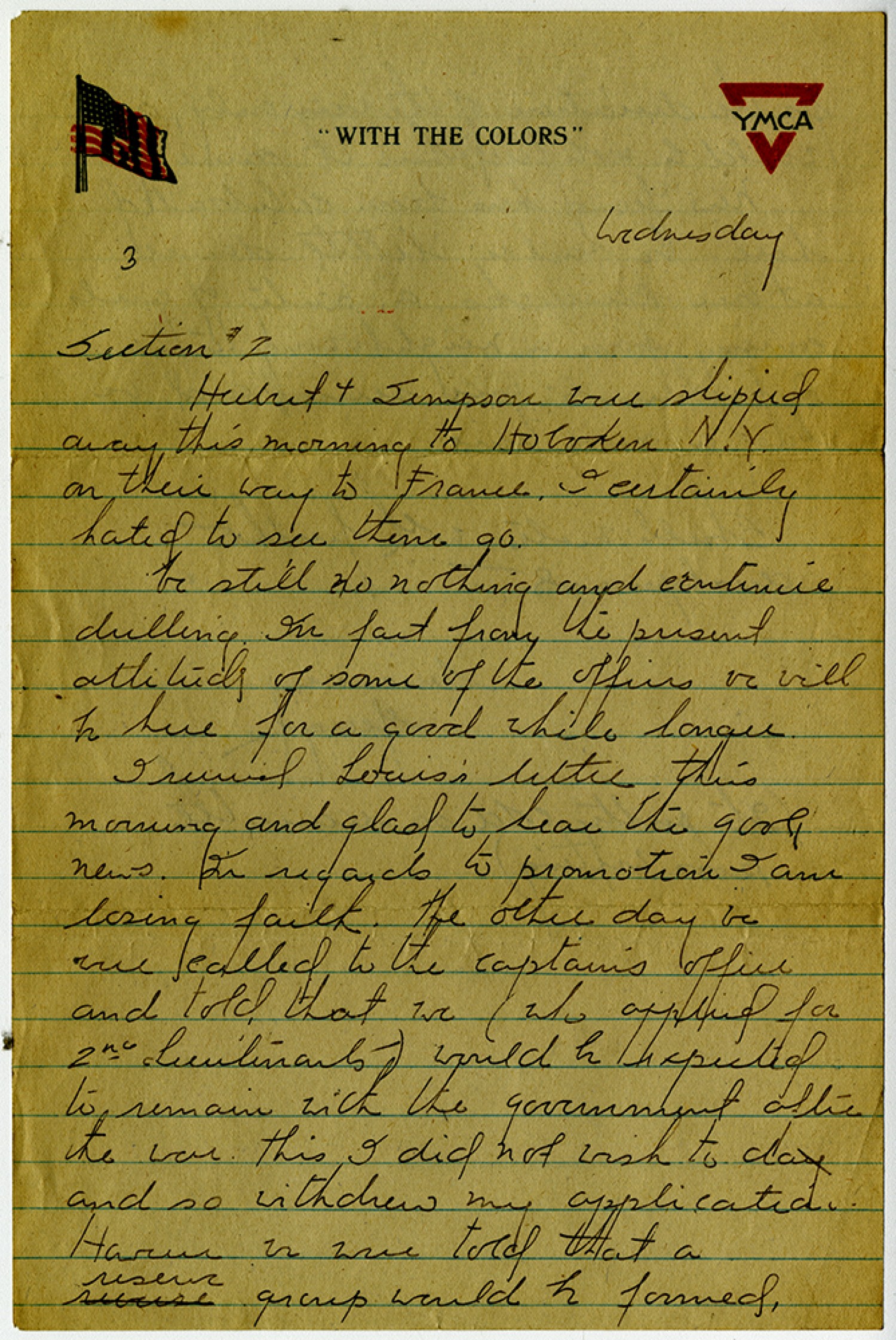 [page 3] Wednesday Section #2 Herbert and Simpson were shipped away this morning to Hoboken, [New Jersey] on their way to France. I certainly hated to see them go. I still no nothing and continue drilling. In fact from the present attitude of some of the officers we will be here for a good while longer. I received Louis’s letter this morning and glad to hear the good news. In regards to the promotion I am losing faith. The other day we were called to the captains office and told that we (who applied for 2nd Lieutenants) would be expected to remain with the government after the war. This I did not wish to do and so withdrew my application. However we were told that a reserve group would be formed,