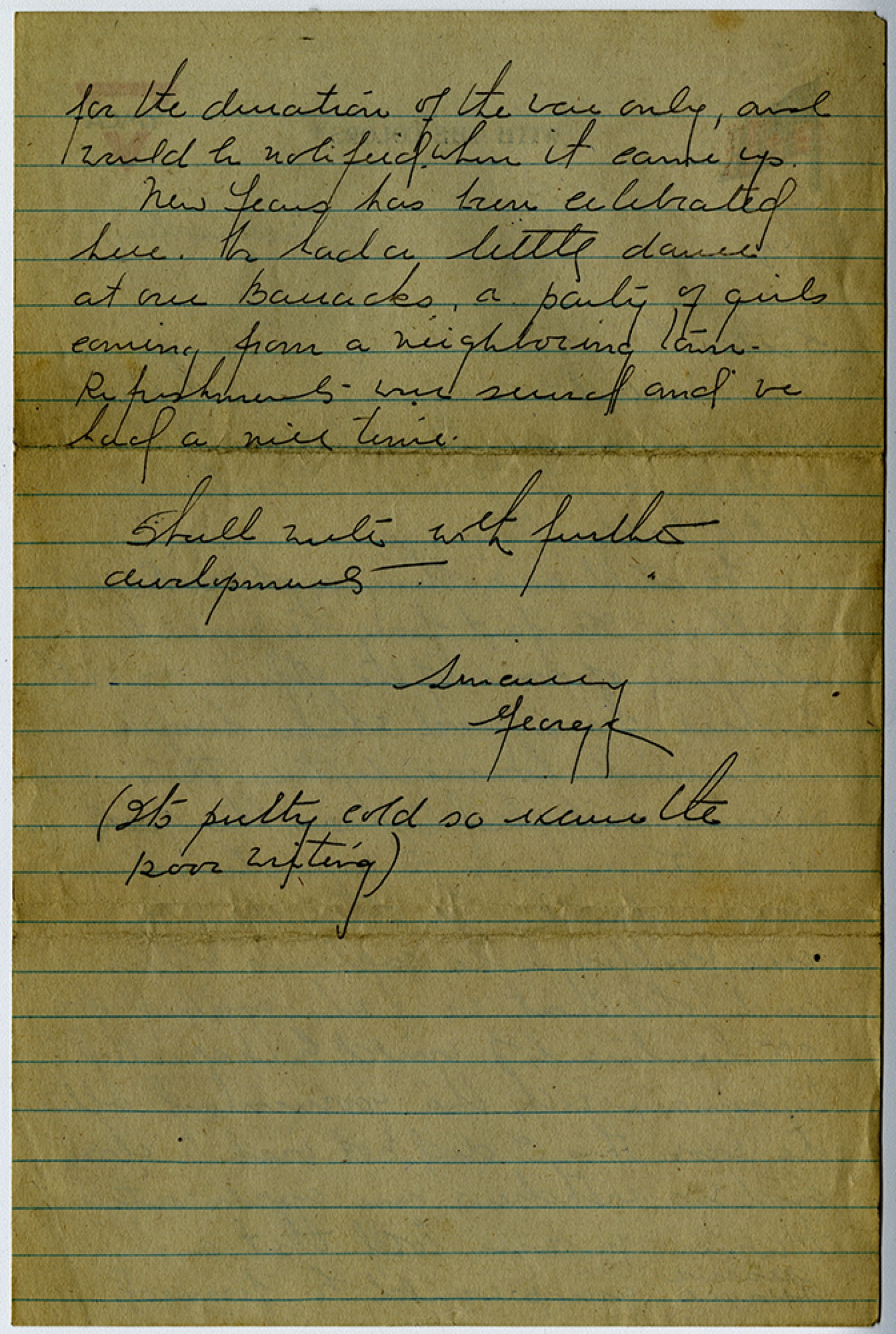 for the duration of the war only, and would be notified when it came up. New Years has been celebrated here. We had a little dance at our Barracks a party of girls coming from a neighboring town. Refreshments were served and we had a nice time. Shall write with further developments – Sincerely George (Its pretty cold so excuse the poor writing)