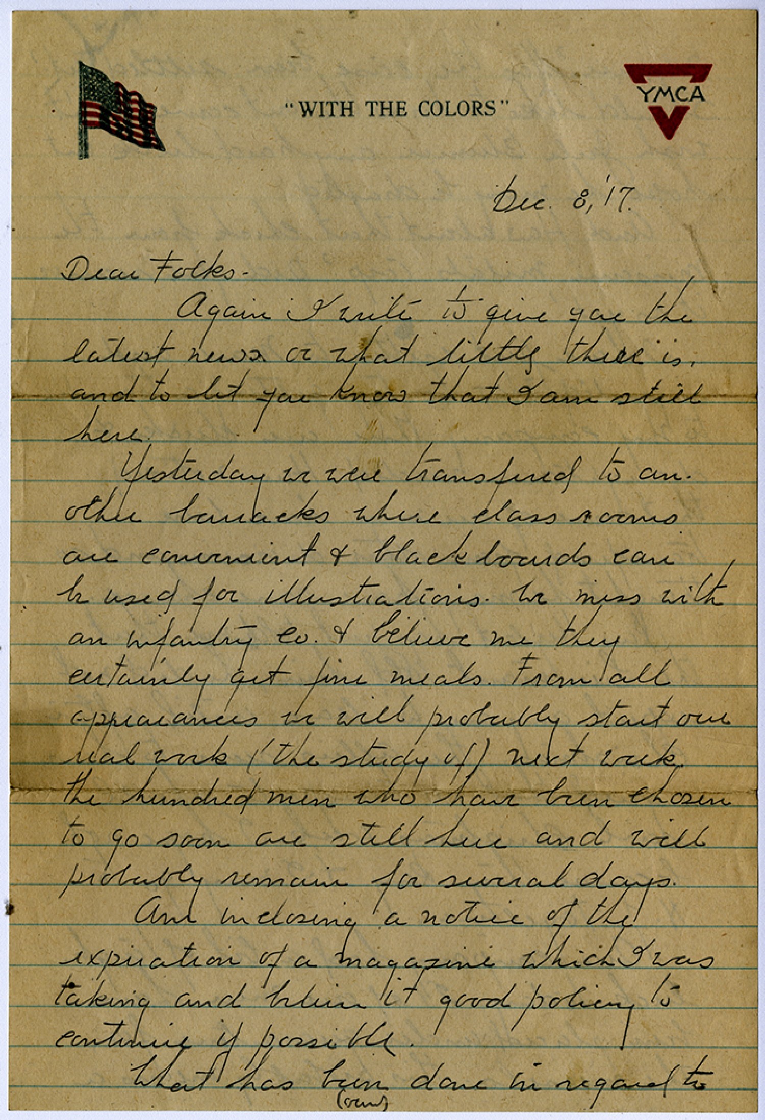 [December] 8, [1917] Dear Folks – Again I write to give you the latest news or what little there is, and to let you know that I am still here. Yesterday we were transferred to another barracks where class rooms are convenient and blackboards can be used for illustrations. We mess with an infantry Co. & believe me they certainly get fine meals. From all appearances we will probably start our real work (the study of) next week the hundred men who have been chosen to go soon are still here and will probably remain for several days. Am inclosing a notice of the expiration of a magazine which I was taking and believe it good policy to continue if possible. What has been done in regard to (over)