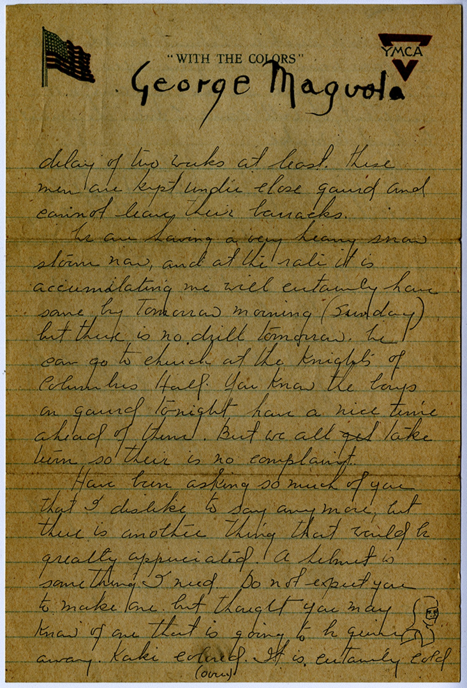 George Maguolo delay of two weeks at least. These men are kept under close guard and cannot leave their barracks. We are having a very heavy snow storm now and at the rate it is accumalating we will certainly have some by tomorrow morning (Sunday) but there is no drill tomorrow. We can go to church at the Knights of Columbus Hall. You know the boys on guard tonight have a nice time ahead of them. But we all take turns so their is no complaint. Have been asking so much of you that I dislike to say any more but there is another thing that would be greatly appreciated. A helmet is something I need. Do not expect you to make one, but thought you may know of one that is going to be given [sketch of helmet] away. Kaki colored. It is certainly cold (over)