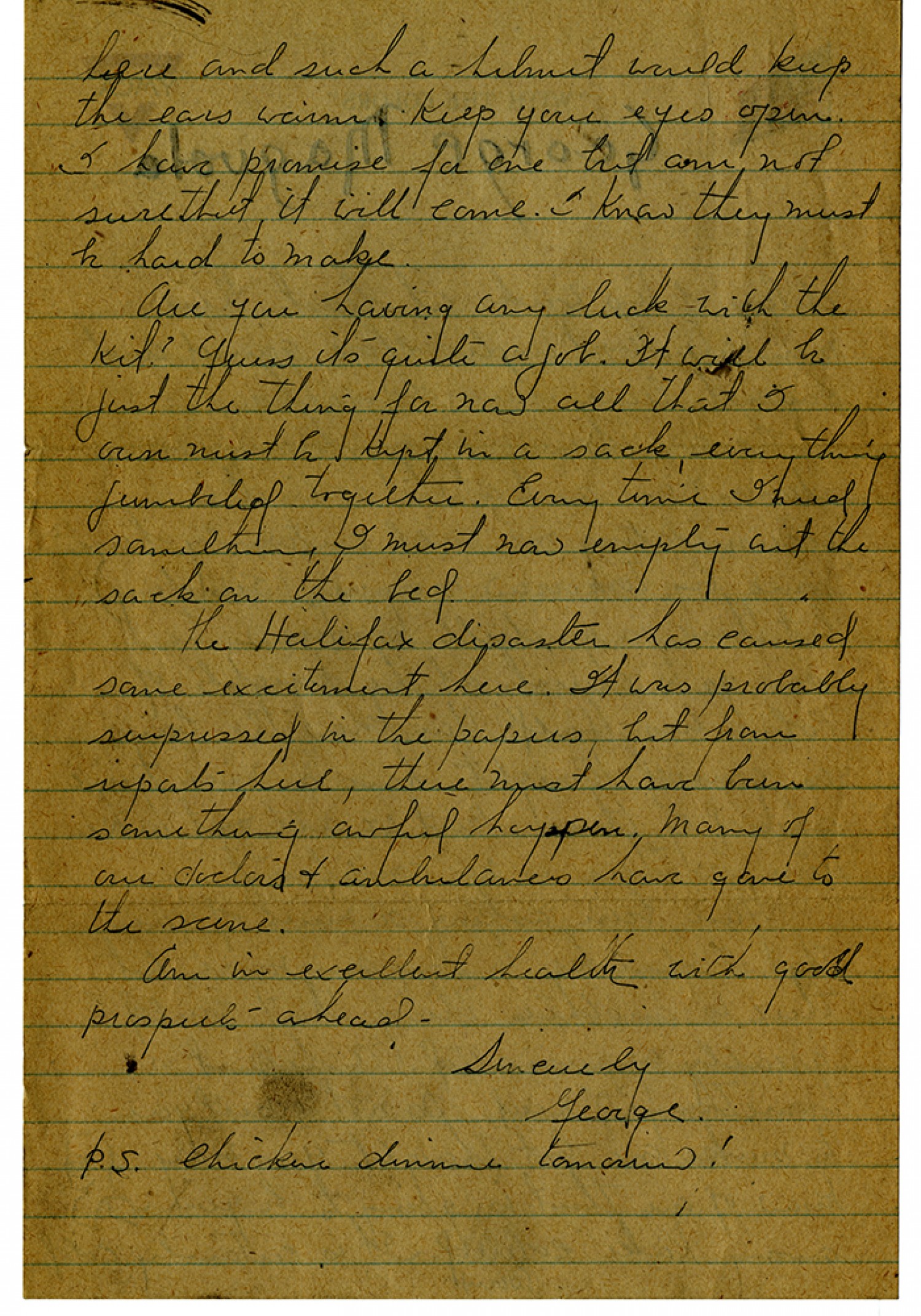 here and such a helmet would keep the ears warm Keep your eyes open. I have promise for one but am not sure that it will come. I know they must be hard to make. Are you having luck with the kit? Guess it’s quite a job. It will be just the thing for now all that I own must be kept in a sack, everything jumbled together. Every time I need something I must now empty out the sack on the bed. The Halifax disaster has caused some excitement here. It was probably surpressed in the papers but from reports here, there must have been something awful happen. Many of our doctors & ambulances have gone to the scene. Am in excellent health with good prospects ahead. Sincerely George. P.S. Chicken dinner tomorrow!