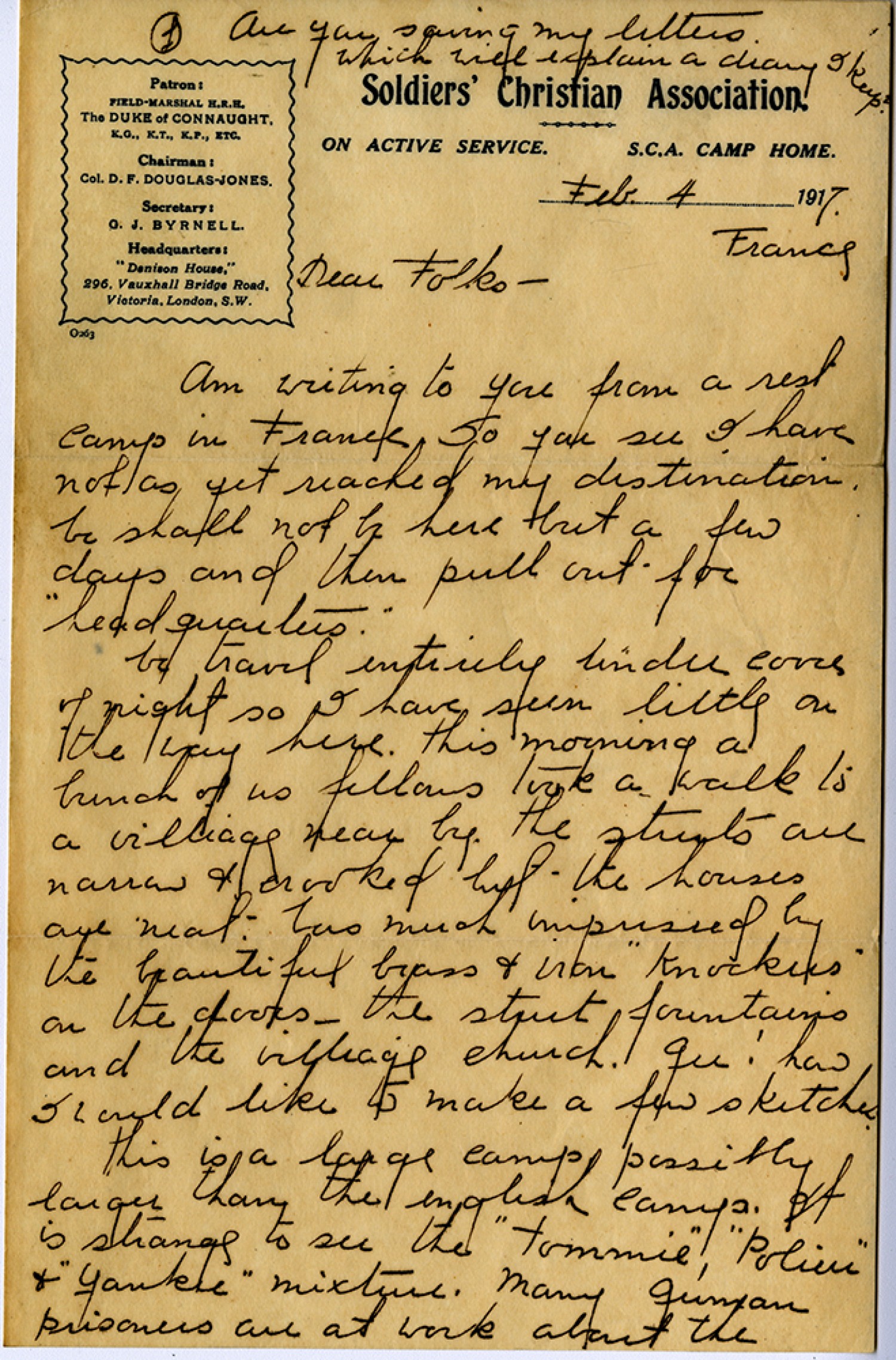 [page 1] Are you saving my letters which will explain a diary I keep? [February] 4, [1918] France Dear Folks – Am writing to you from a rest camp in France. So you see I have not as yet reached my destination. We shall not be here but a few days and then pull out for “headquarters.” We travel entirely under the cover of night so I have seen little on the way here. this morning a bunch of us fellows took a walk to a village near by. the streets are narrow & crooked but the houses are neat. Was much impressed by the beautiful brass and iron “knockers” on the doors – the street fountains and the village church. gee! how I would like to make a few sketches. this is a large camp possibly larger than the english camp. It is strange to see the “tommie,” “Polieu” & “Yankee” mixture. Many german prisoners are at work about the