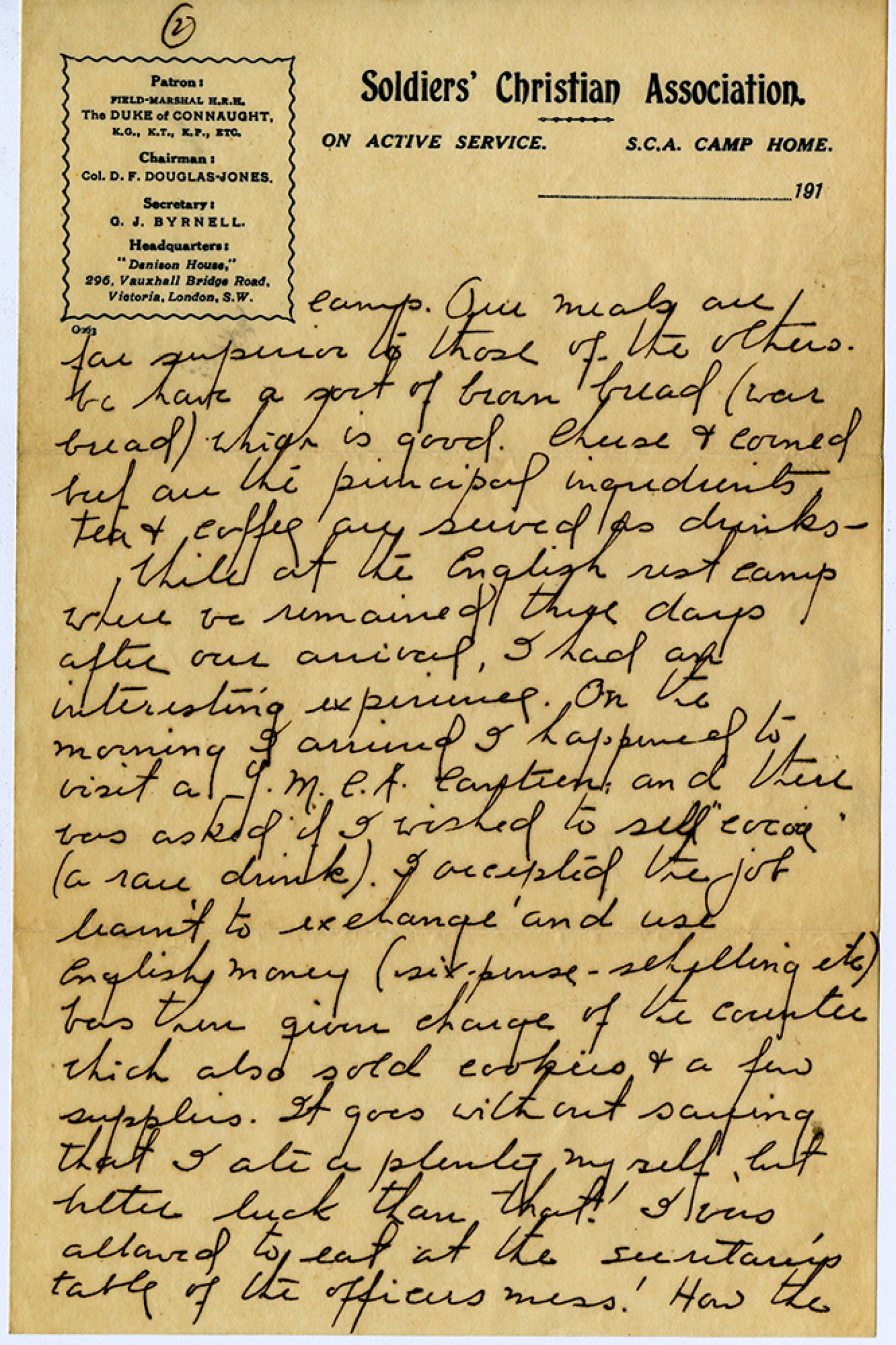 [page2] camp. Our meals are far superior to those of the others. We have a sort of brown bread (war bread) which is good. Cheese and corned beef are the principal ingredients tea and coffee are served as drinks - While at the English rest camp where we remained three days after our arrival. I had an interesting experience. On the morning I arrived I happened to visit a Y.M.C.A. Canteen and there was asked if I wished to sell “cocoa” (a rare drink). I accepted the job learn’t to exchange and use English money (six-pense –schilling etc) Was then given charge of the counter which also sold cookies & a few supplies. It goes with out saying that I ate a plenty myself, but better luck than that! I was allowed to eat at the secretary’s table of the officers mess! How the