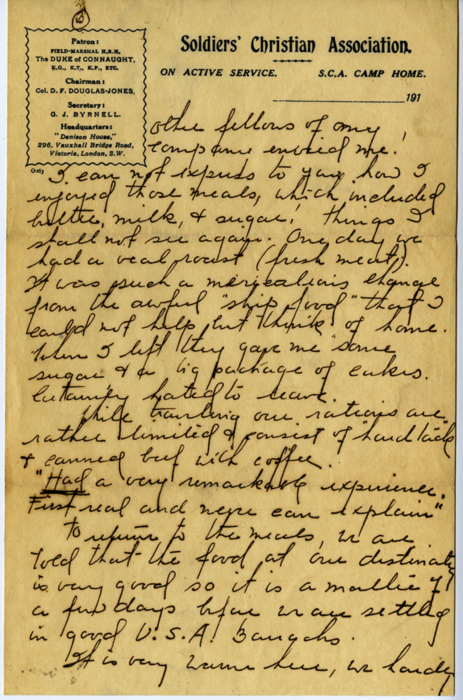 [page 3] other fellows of my camp [ms illegible: 1 wd] envied me! I can not express to you how I enjoyed those meals, which included butter, milk, and sugar! Things I shall not see again. One day we had a real roast (fresh meat). It was such a mericalious change from the awful “ship food’ that I could not help but think of home. When I left they gave me some sugar & a big package of cakes. Certainly hated to leave. While traveling our rations are rather limited and consist of “hard tack” and canned beef with coffee. “Had a very remarkable experience. First real and never can explain” To return to the meals, we are told that the food at our destination is very good so it is a matter of a few days before we are settled in good U. S. A. Barracks. It is very warm here, we hardly