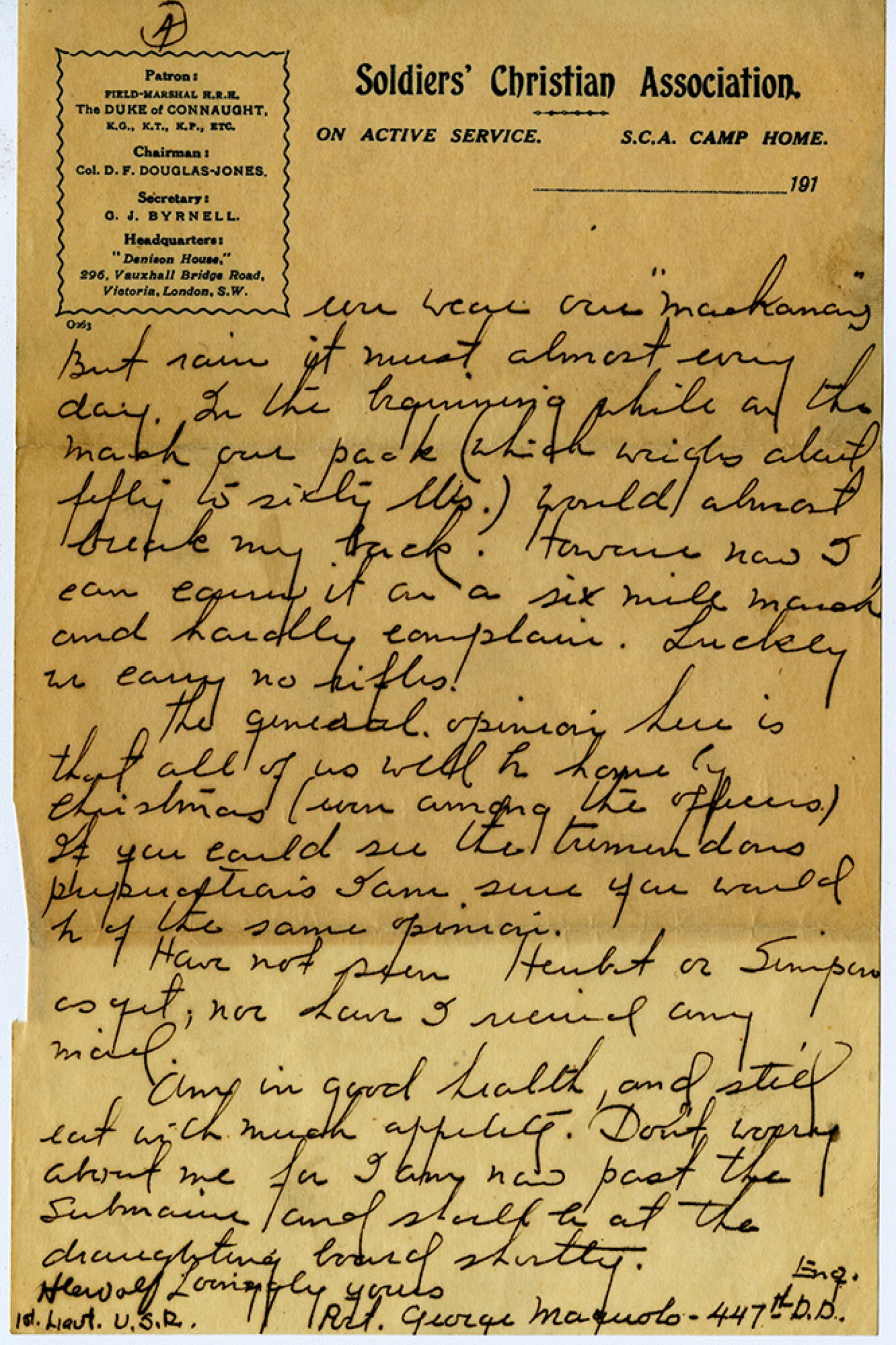 [page 4] can wear our [ms illegible: 1 wd] But rain it must almost every day. In the beginning while on the march our pack (which weighs about fifty to sixty lbs.) Would almost break my back. However now I can carry it on a six mile march and hardly complain. Luckily we carry no rifles. The general opinion here is that all of us will be home by Christmas (even among the officers) If you could see the tremendous preparations I am sure you would be of the same opinion. Have not seen Herbert or Simpson as yet, nor have I received any mail. Am in good health, and still eat with much appetite. Don’t worry about me for I am now past the Submarine and shall be at the draughting board shortly. Lovingly yours [Private] George Maguolo – 447th [Depot Detachment Engineers] [censor signature]