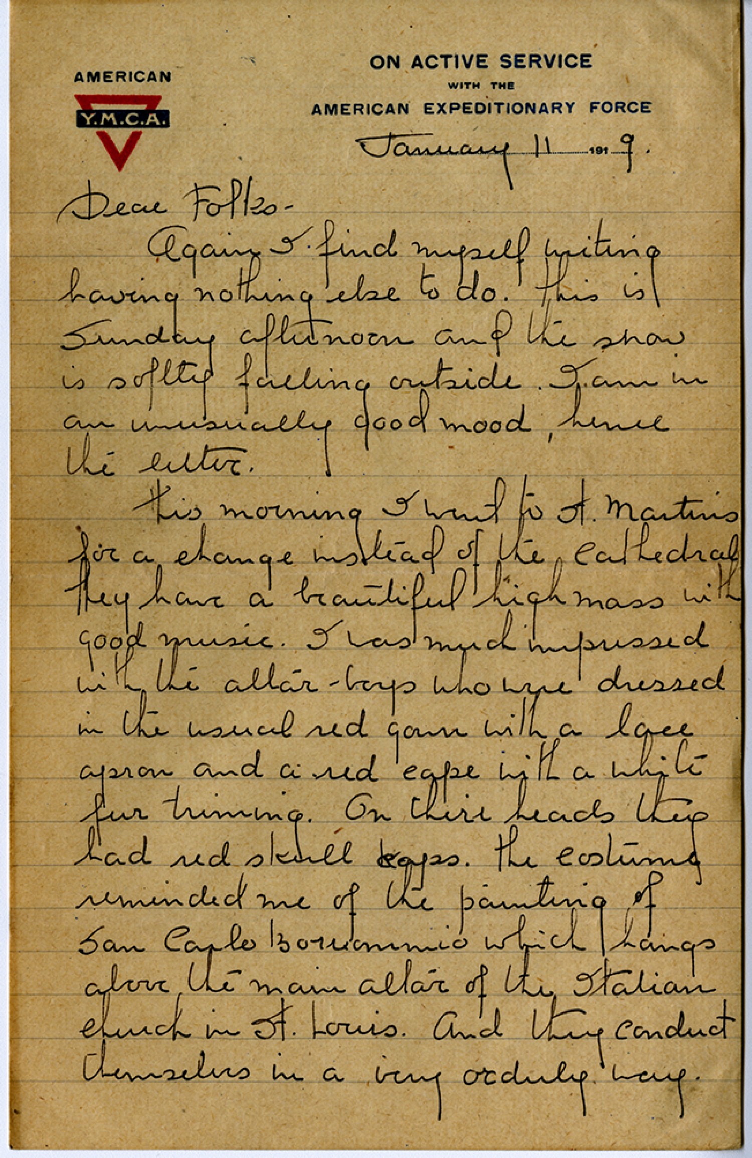 January 11, [1919] Dear Folks - Again I find myself writing having nothing else to do. this is Sunday afternoon and the snow is softly falling outside. I am in an unusually good mood, hence the letter. this morning I went to St. Martins for a change instead of the Cathedral. they have a beautiful high mass with good music. I was much impressed with the altar-boys who were dressed in the usual red gown with a lace apron and a red cape with a white trimming. On their heads they had red skull caps. The costume reminded me of the painting of San Carlo Borriommio which hangs above the main altar of the Italian church in St. Louis. And they conduct themselves in a very orderly way.
