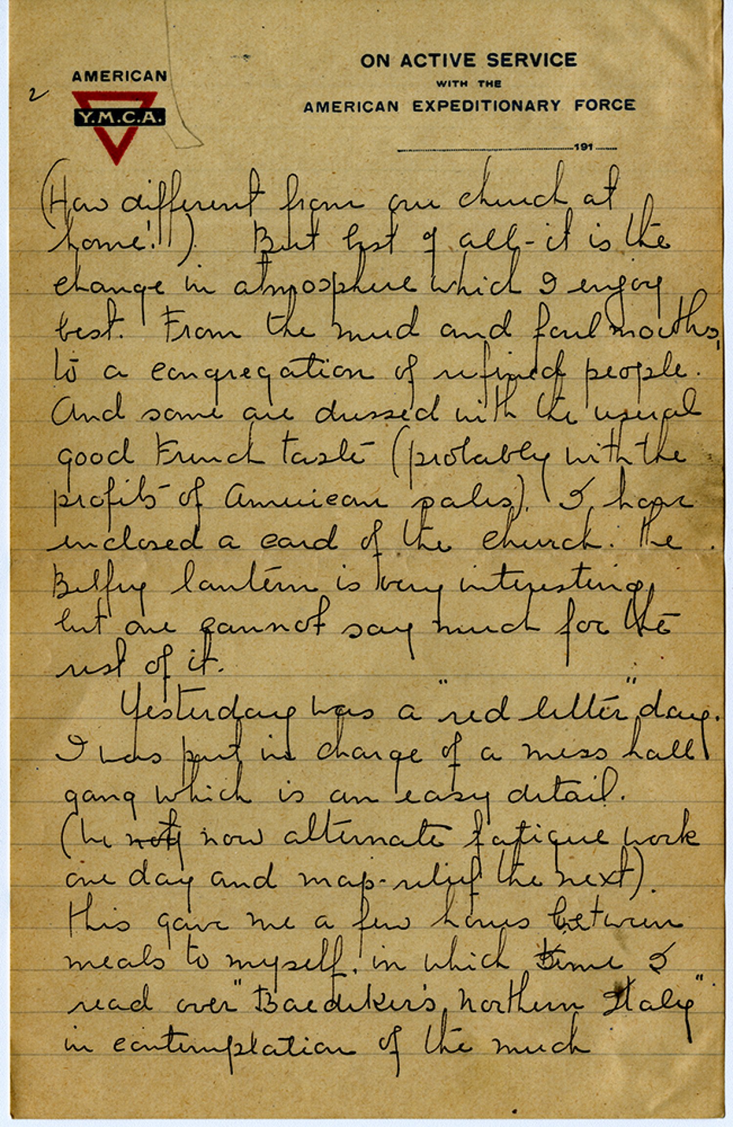 [page 2] (How different from our church at home!) But best of all - it is the change in atmosphere which I enjoy best. From the mud and foul mouths, to a congregation of refined people. and some are dressed with the usual good French taste (probably with the profits of American sales). I have enclosed a card of the Church. the Belfry lantern is very interesting but one cannot say much for the rest of it. Yesterday was a “red letter” day. I was put in charge of a mess hall gang which is an easy detail. (We now alternate fatique work one day and map relief the next). this gave me a few hours between meals to myself in which time I read over “Baedikers Nothern Italy” in contemplation of the much