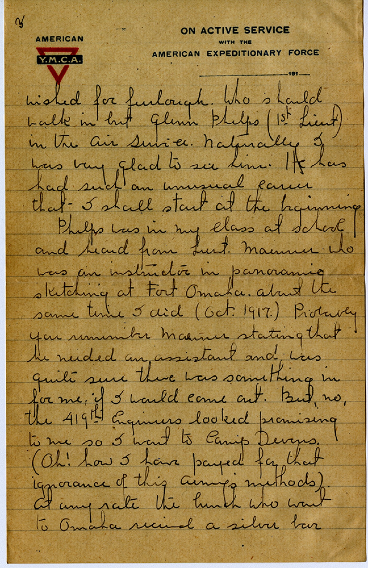[page 3] wished for furlough. Who should walk in but Glenn Phelps (1st Lieut) in the Air Service. Naturally I was very glad to see him. He has had such an unusual career that I shall start at the beginning. Phelps was in my class at school and heard from Lieut. Maenner who was an instructor in panoramic sketching at Fort Omaha about the same time I did ([October] 1917) Probably you remember Maenner stating that he needed an assistant and was quite sure there was something in for me, if I would come out. But no, the 419th Engineers looked promising to me so I went to Camp Devens. (Oh! how I have payed for that ignorance of this Army’s methods). At any rate the bunch who went to Omaha received a silver bar