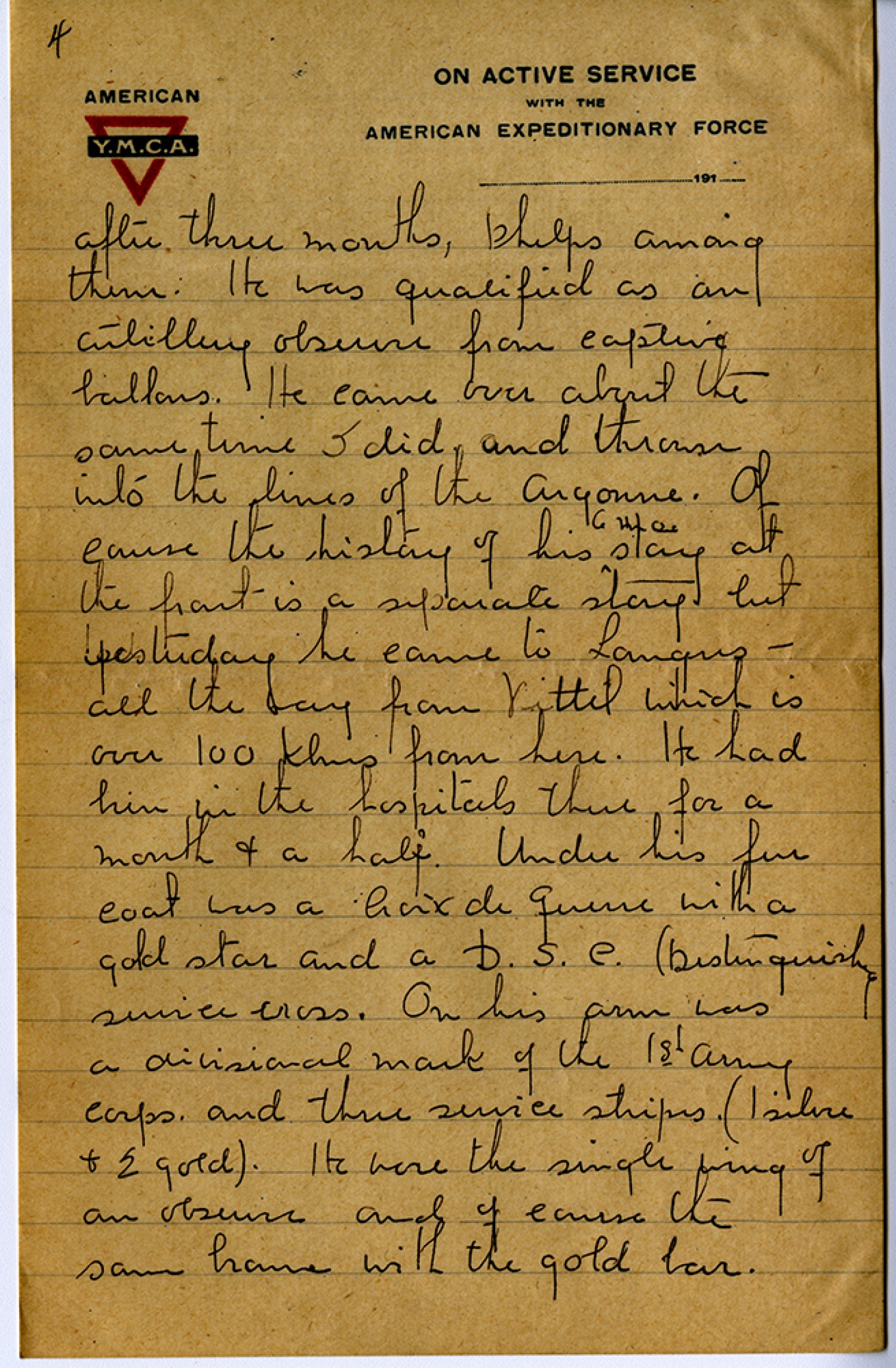 [page 4] after three months, Phelps among them. He was qualified as an artillery observer from captive balloons. He came over about the same time I did and thrown into the lines of the Argonne. Of course the history of his 6 mo. stay at the front is a separate story but yesterday he came to Langers – all the way from Vittel which is over 100 klms from here. He had been in the hospitals there for a month & a half. Under his fur coat was Croix de guerre with a gold star and D. S. C. (Distinguished service cross. On his arm was a divisional mark of 1st Army Corps and three service stripes. (1 silver & 2 gold). He wore the single wing of an observer and of course the same [ms illegible: 1 wd] with the gold bar.