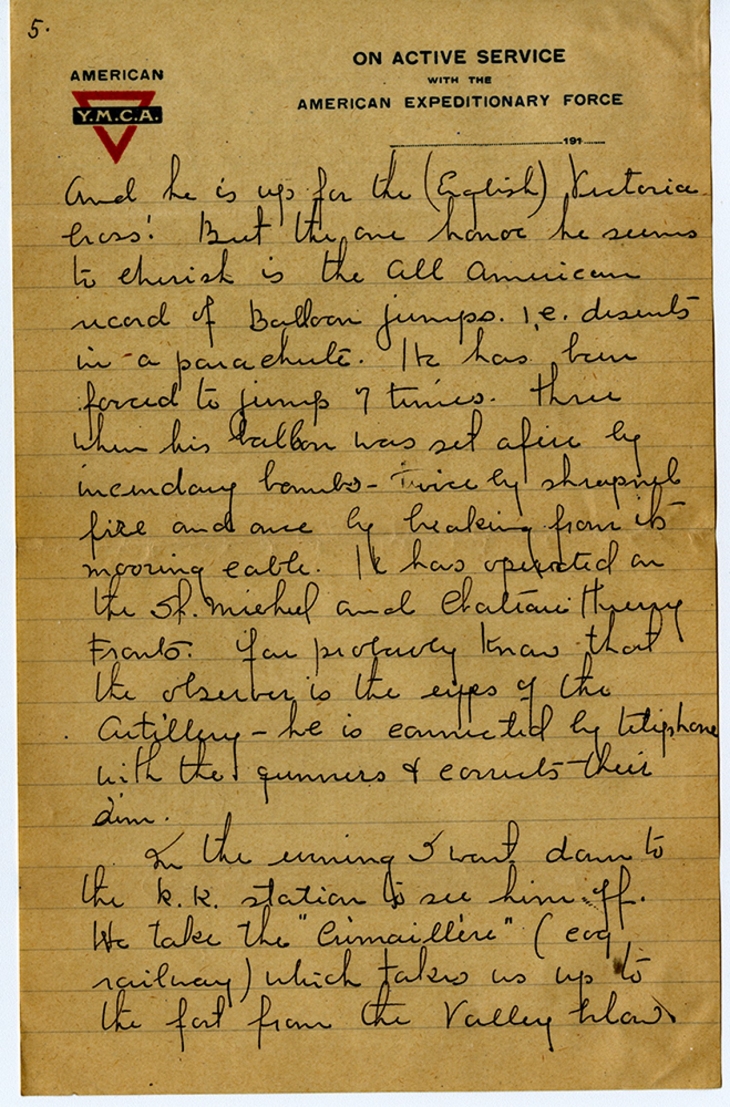 [page 5] And he is up for the (English) Victoria Cross! But the one honor he seems to cherish is the All American record of Balloon jumps. i.e. deserts in a parachute. He has been forced to jump 7 times. three when his balloon was set a fire by incendary bombs – twice by shrapnel fire and once by breaking from its mooring cable. He has operated on the St. Mihiel and Chateau Thierry Fronts. You probably know that the observer is the eyes of the Artillery – he is connected by telephone with the gunners & corrects their aim. In the evening I went down to the R.R. station to see him off. We take the “Cumaillere” (eug railway) which takes us up to the fort from the valley below