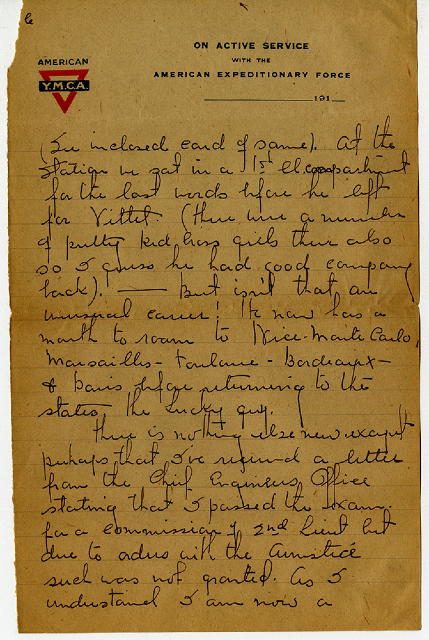 [page 6] (See inclosed card of same). At the station we sat in a 1st cl. compartment for the last words before he left for Vittel. (there were a number of pretty Red Cross girls there also so I guess he had good company back). – But isn’t that an unusual career! He now has a month to roam to Nice – Monte Carlo, Marsailles - Touloue – Bordeaux- & Paris before returning to the states the lucky guy. There is nothing else new except perhaps that I’ve received a letter from the Chief Engineers Office stating that I passed the exam for a commision of 2nd Lieut but due to orders with the Armistice such was not granted. As I understand I am now a