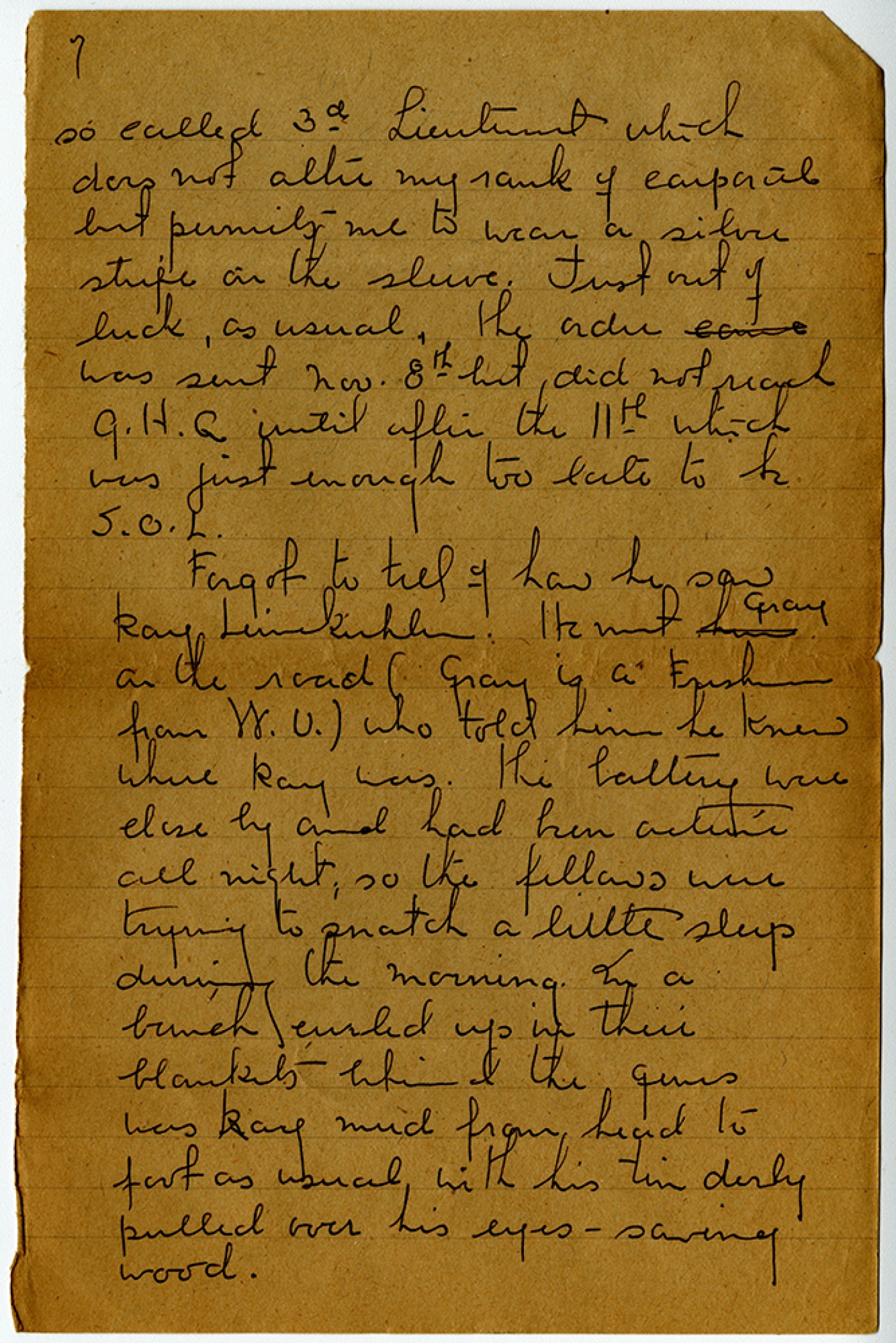 [page 7] so called 3rd Lieutenant which does not alter my rank of corporal but permits me to wear a silver stripe on the sleeve. Just out of luck, as usual, the order was sent [November] 8th but did not reach [General Headquarters] until after the 11th which was just enough too late to be S.O.L. Forgot to tell of how he saw Ray Lieukuhler. He met gray on the road (gray is a Freshman from [Washington University]) who told him he knew were Ray was. The battery were close by and had been active all night, so the fellows were trying to snatch a little sleep during the morning. In a bunch curled up in their blankets behind the guns was Ray mud from head to foot as usual, with his tin dirty pulled over his eyes - sawing wood.